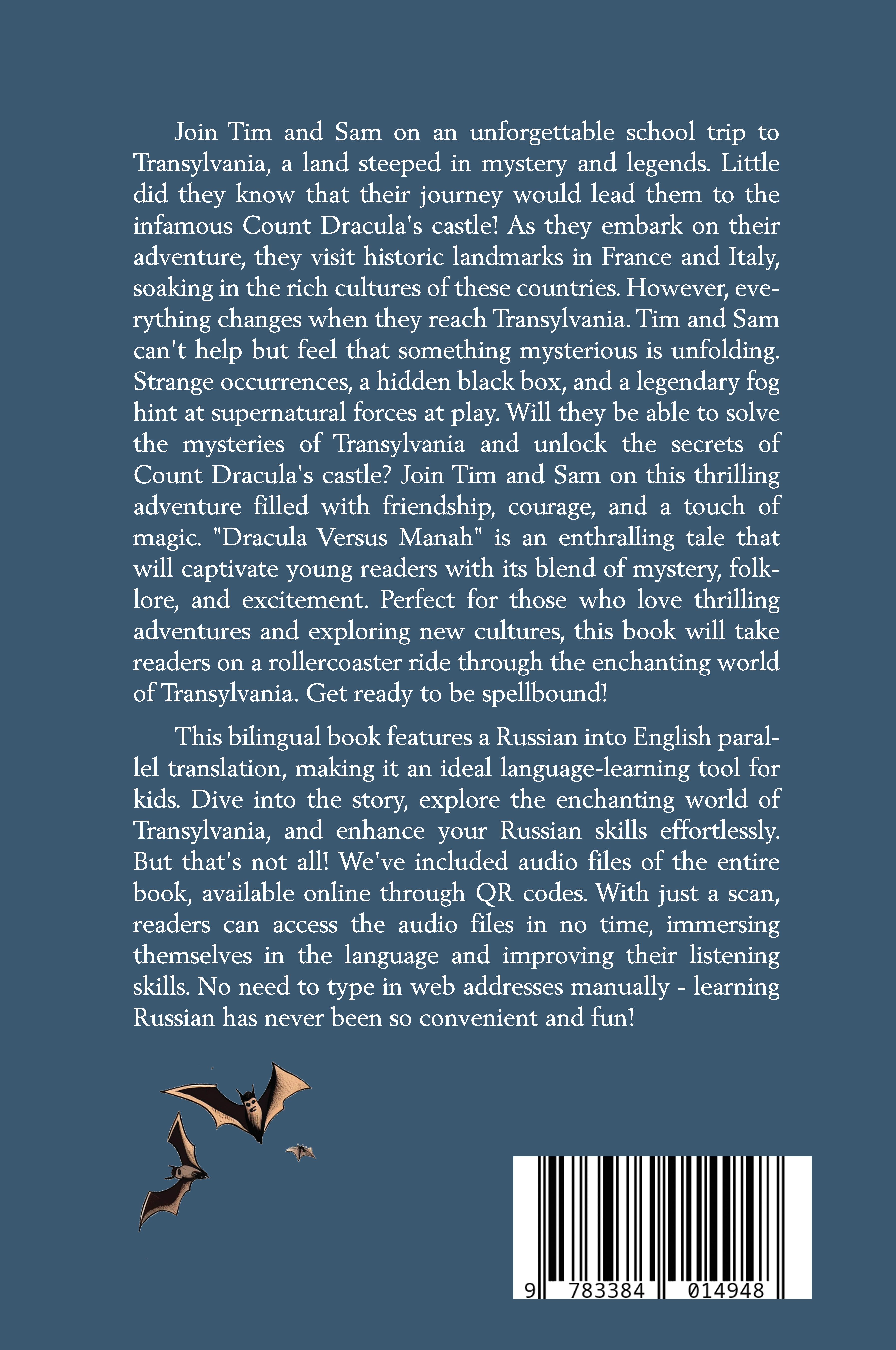 Join Tim and Sam on an unforgettable school trip to Transylvania, a land steeped in mystery and legends. Little did they know that their journey would lead them to the infamous Count Dracula's castle! As they embark on their adventure, they visit historic landmarks in France and Italy, soaking in the rich cultures of these countries. However, everything changes when they reach Transylvania. Tim and Sam can't help but feel that something mysterious is unfolding. Strange occurrences, a hidden black box, and a legendary fog hint at supernatural forces at play. Will they be able to solve the mysteries of Transylvania and unlock the secrets of Count Dracula's castle? Join Tim and Sam on this thrilling adventure filled with friendship, courage, and a touch of magic. "Dracula Versus Manah" is an enthralling tale that will captivate young readers with its blend of mystery, folklore, and excitement. Perfect for those who love thrilling adventures and exploring new cultures, this book will take readers on a rollercoaster ride through the enchanting world of Transylvania. Get ready to be spellbound!This bilingual book features a Russian into English parallel translation, making it an ideal language-learning tool for kids. Dive into the story, explore the enchanting world of Transylvania, and enhance your Russian skills effortlessly. But that's not all! We've included audio files of the entire book, available online through QR codes. With just a scan, readers can access the audio files in no time, immersing themselves in the language and improving their listening skills. No need to type in web addresses manually - learning Russian has never been so convenient and fun!