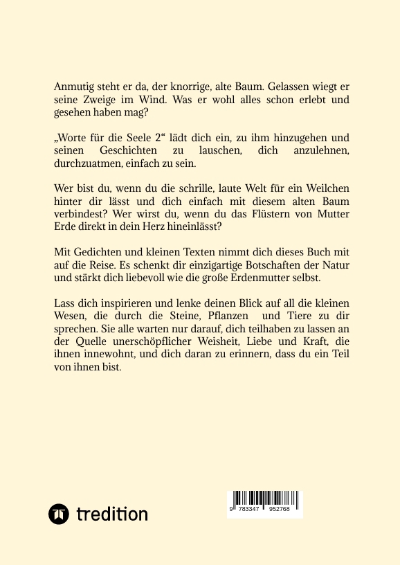 | Schlagworte | Baum • Erdung • Kraft • Natur • Naturbotschaften • Naturwesen • Pflanzen • Poesie • Seele • Spiritualität • Urvertrauen |