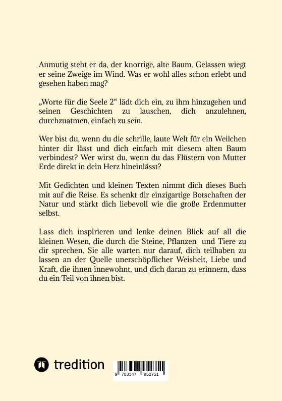 | Schlagworte | Baum • Erdung • Kraft • Natur • Naturbotschaften • Naturwesen • Pflanzen • Poesie • Seele • Spiritualität • Urvertrauen |