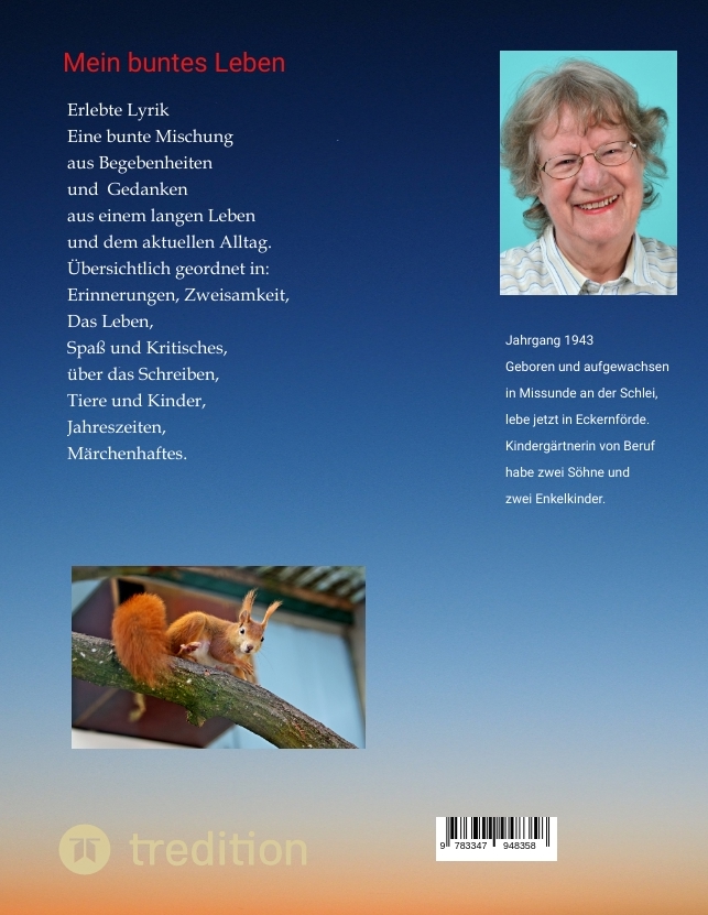 Gedichte lesen hat das ganze Leben der Autorin bereichert. Fröhliche Gedichte haben erfreut, nachdenkliche Gedichte haben getröstet und Mut gemacht. Selber schreiben war der Autorin stets ein Wunschtraum, der erst in Erfüllung ging, als eine innere Notlage ein Ventil forderte. - Danach entstanden Gedichte und Gedichte aus ihrer Feder in bunter Mischung, die nur das Leben selbst hervorbringen kann.