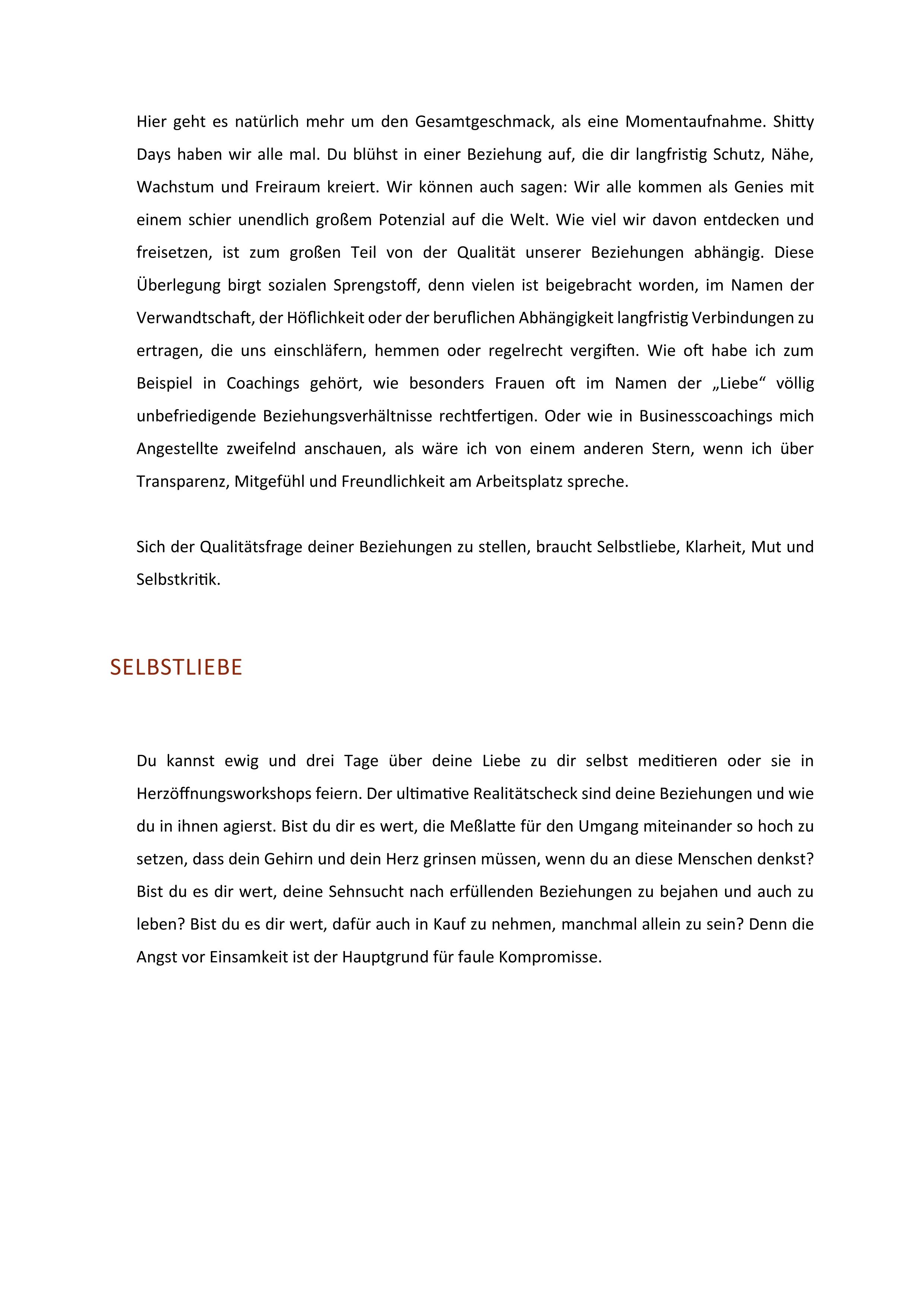Dieses Buch handelt von Selbstliebe und davon, wie du dich selbst von ganzem Herzen, beständig, aufrichtig, treu und kompromisslos lieben lernen kannst. Es zeigt auf, wie sie die wesentlichen Bereiche deines Lebens - Berufung, Beruf, Beziehungen, Finanzen - positiv und von innen heraus verwandelt.