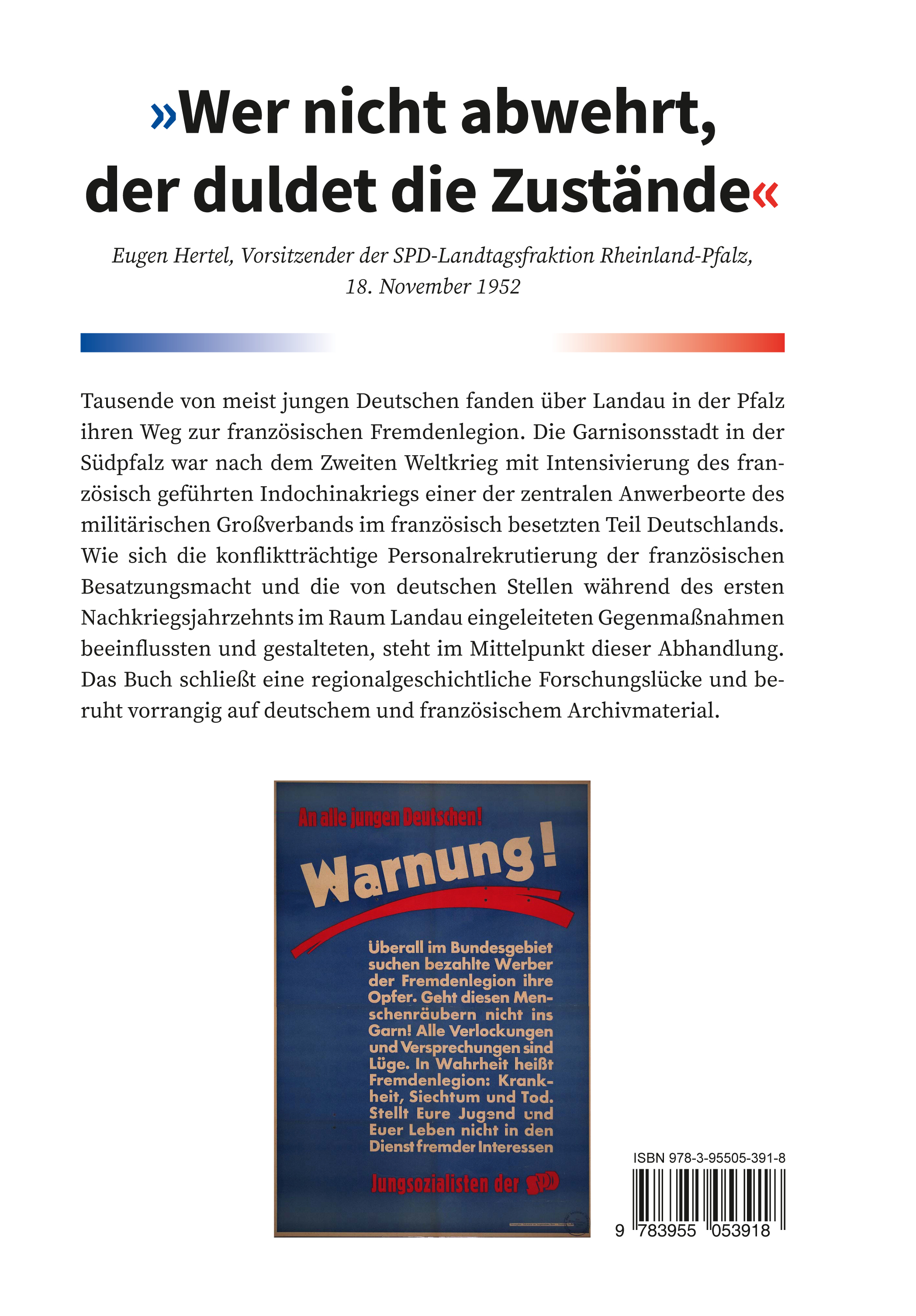 Tausende von meist jungen Deutschen fanden über Landau in der Pfalz ihren Weg zur französischen Fremdenlegion. Die Garnisonsstadt in der Südpfalz war nach dem Zweiten Weltkrieg mit Intensivierung des französisch geführten Indochinakriegs einer der zentralen Anwerbeorte des militärischen Großverbands im französisch besetzten Teil Deutschlands. Wie sich die konfliktträchtige Personalrekrutierung der französischen Besatzungsmacht und die von deutschen Stellen während des ersten Nachkriegsjahrzehnts im Raum Landau eingeleiteten Gegenmaßnahmen beeinflussten und gestalteten, steht im Mittelpunkt dieser Abhandlung. Das Buch schließt eine regionalgeschichtliche Forschungslücke und beruht vorrangig auf deutschem und französischem Archivmaterial.