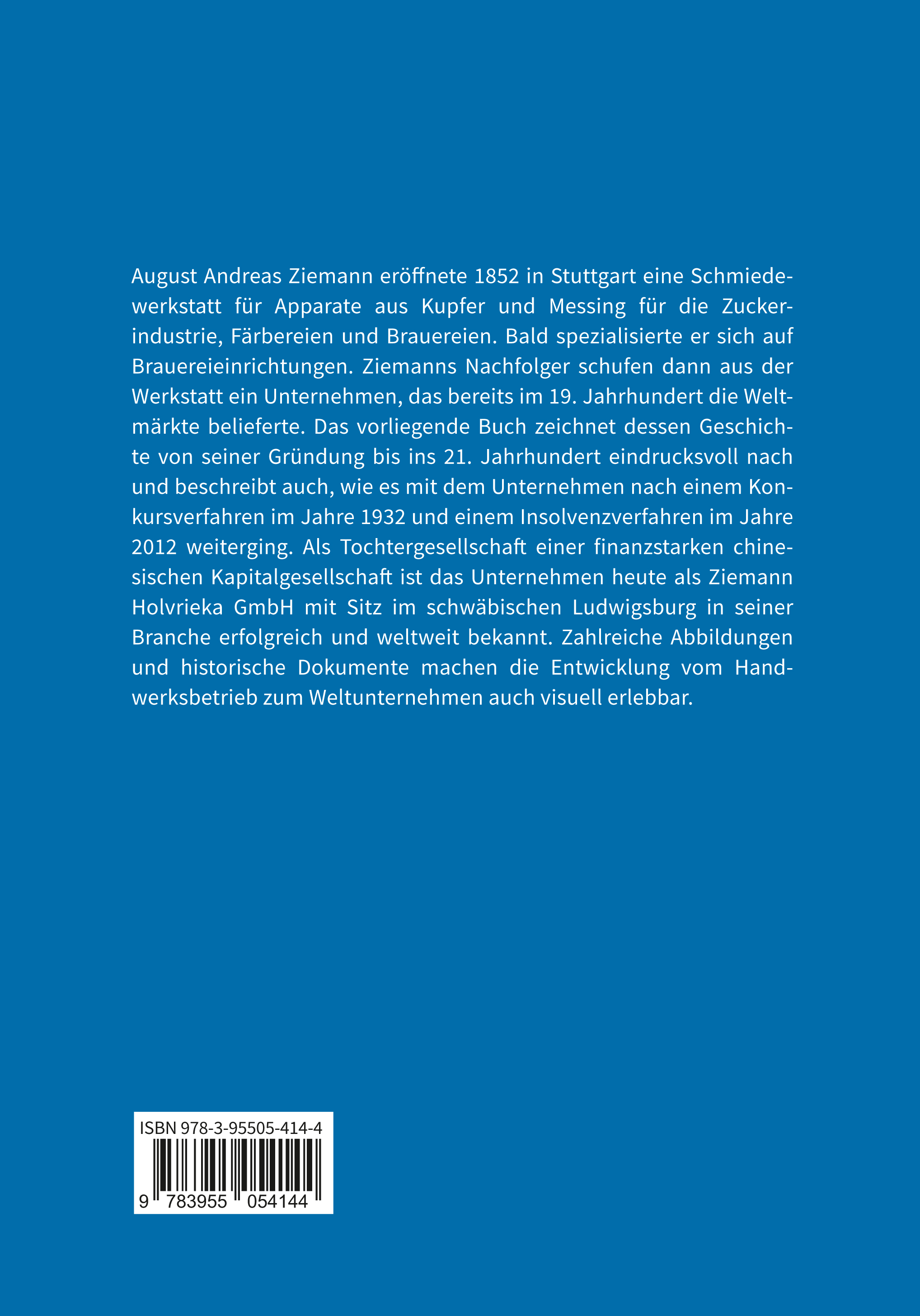 August Andreas Ziemann eröffnete 1852 in Stuttgart eine Schmiedewerkstatt für Apparate aus Kupfer und Messing für die Zuckerindustrie, Färbereien und Brauereien. Bald spezialisierte er sich auf Brauereieinrichtungen. Ziemanns Nachfolger schufen dann aus der Werkstatt ein Unternehmen, das bereits im 19. Jahrhundert die Weltmärkte belieferte. Das vorliegende Buch zeichnet dessen Geschichte von seiner Gründung bis ins 21. Jahrhundert eindrucksvoll nach und beschreibt auch, wie es mit dem Unternehmen nach einem Konkursverfahren im Jahre 1932 und einem Insolvenzverfahren im Jahre 2012 weiterging. Als Tochtergesellschaft einer finanzstarken chinesischen Kapitalgesellschaft ist das Unternehmen heute als Ziemann Holvrieka GmbH mit Sitz im schwäbischen Ludwigsburg in seiner Branche erfolgreich und weltweit bekannt. Zahlreiche Abbildungen und historische Dokumente machen die Entwicklung vom Handwerksbetrieb zum Weltunternehmen auch visuell erlebbar.