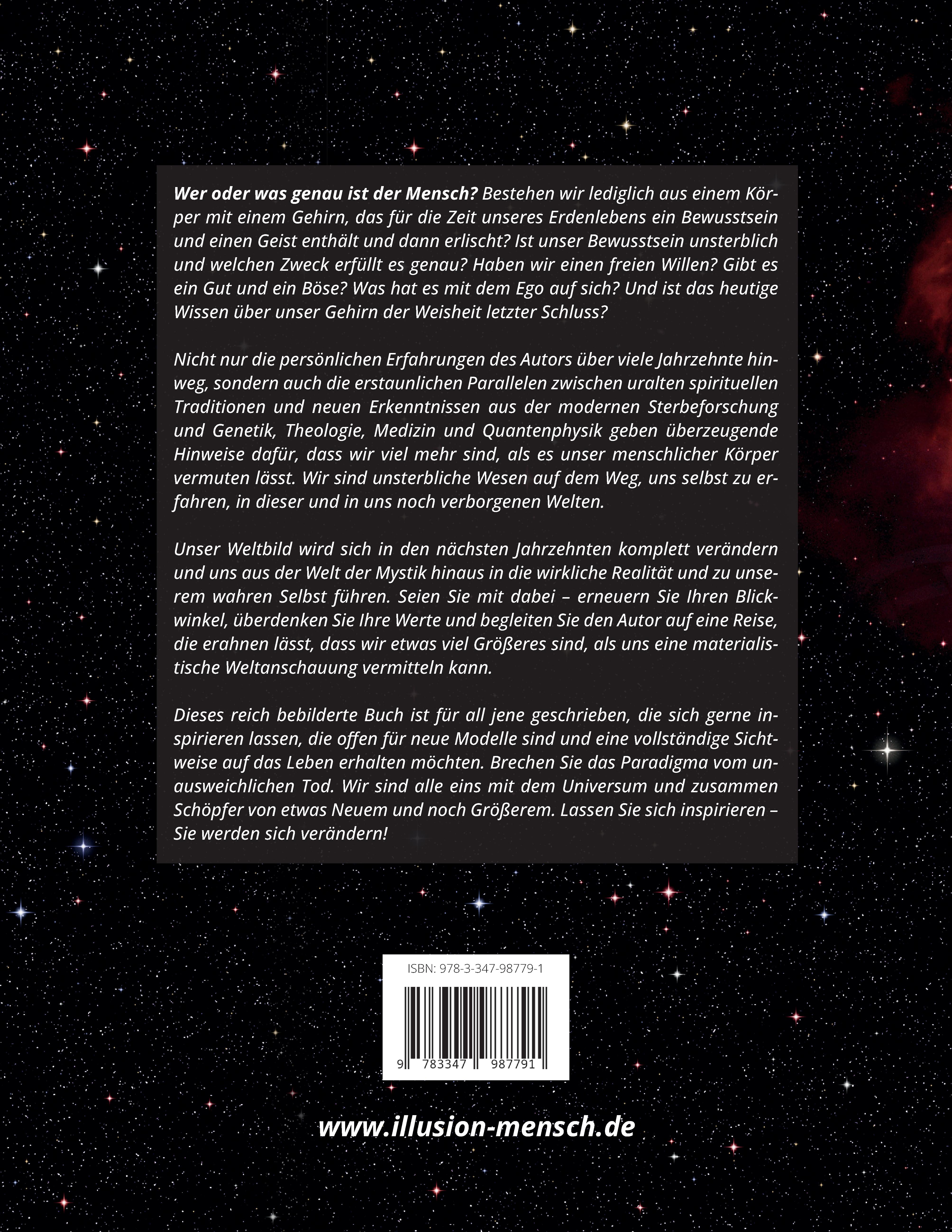 Wer oder was ist der Mensch? Welche Fähigkeiten besitzt er? Informationen zum Titel Wer oder was genau ist der Mensch? Bestehen wir lediglich aus einem Körper mit einem Gehirn, das für die Zeit unseres Erdenlebens ein Bewusstsein und einen Geist enthält und dann erlischt? Ist unser Bewusstsein unsterblich und welchen Zweck erfüllt es genau? Haben wir einen freien Willen? Gibt es ein Gut und ein Böse? Was hat es mit dem Ego auf sich? Und ist das heutige Wissen über unser Gehirn der Weisheit letzter Schluss? Nicht nur die persönlichen Erfahrungen des Autors über viele Jahrzehnte hinweg, sondern auch die erstaunlichen Parallelen zwischen uralten spirituellen Traditionen und neuen Erkenntnissen aus der modernen Sterbeforschung und Genetik, Theologie, Medizin und Quantenphysik geben überzeugende Hinweise dafür, dass wir viel mehr sind, als es unser menschlicher Körper vermuten lässt. Wir sind unsterbliche Wesen auf dem Weg, uns selbst zu erfahren, in dieser und in uns noch verborgenen Welten. Unser Weltbild wird sich in den nächsten Jahrzehnten komplett verändern und uns aus der Welt der Mystik hinaus in die wirkliche Realität und zu unserem wahren Selbst führen. Seien Sie mit dabei - erneuern Sie Ihren Blickwinkel, überdenken Sie Ihre Werte und begleiten Sie den Autor auf eine Reise, die erahnen lässt, dass wir etwas viel Größeres sind, als uns eine materialistische Weltanschauung vermitteln kann. Dieses reich bebilderte Buch ist für all jene geschrieben, die sich gerne inspirieren lassen, die offen für neue Modelle sind und eine vollständige Sichtweise auf das Leben erhalten möchten. Brechen Sie das Paradigma vom unausweichlichen Tod. Wir sind alle eins mit dem Universum und zusammen Schöpfer von etwas Neuem und noch Größerem. Lassen Sie sich inspirieren - Sie werden sich verändern.