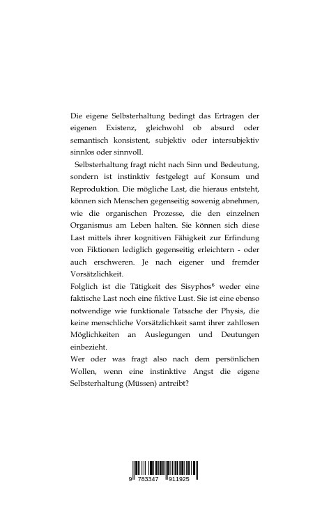 | Schlagworte | Aktionspräferenz • Anpassungsdruck • Anspruch • Bedeutung • Bindungsfähigkeit • Determinismus • Eigenverantwortung • Empathie • Enthemmung • Entscheidungsbaum • Entscheidungsfreiheit • Erwartung • Erwartungsdruck • Fakten • Fiktionen • Fiktionen Fakten Erwartung Anspruch Schwarmverhalten Gruppendynamik Stammespräferenz Aktionspräferenz Kausalität Erwartungsdruck Anpassungsdruck Wachstumsdruck Selbstverstärkung Selbstregulierung Will • Fiktionen Fakten Erwartung Anspruch Schwarmverhalten Gruppendynamik Stammespräferenz Aktionspräferenz Kausalität Erwartungsdruck Anpassungsdruck Wachstumsdruck Selbstverstärkung Selbstregulierung Willensfreiheit Entscheidungsfreiheit Eigenverantwortung Kooperation Selbstbehauptung Bindungsfähigkeit Glauben Sinn Bedeutung Kontingenz Reaktionsmus Nicht-Tun Sein-Lassen Determinismus Leere • Gewissen • Glauben • Gruppendynamik • Hemmung • Kausalität • Kontingenz • Kooperation • Leere • Nicht-Tun • Reaktionsmus • Schwarmverhalten • Sein-Lassen • Selbstbehauptung • Selbsterhaltung • Selbstoptimierung • Selbstregulierung • Selbstverstärkung • Sinn • Stammespräferenz • Unterlassen • Wachstumsdruck • Willensfreiheit |