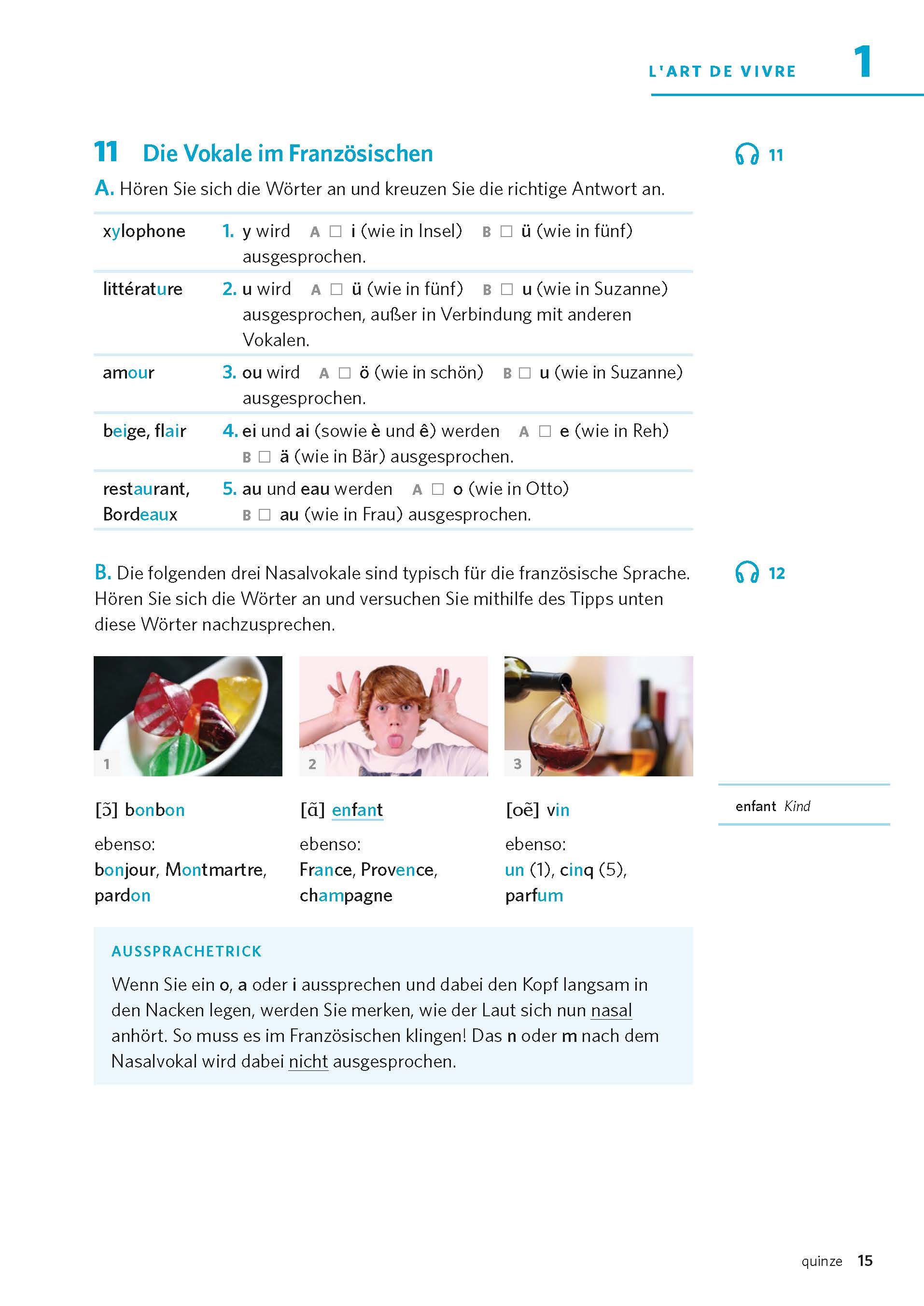 Starten Sie den Sprachkurs mit einem umfangreichen Aussprachetraining, um die französische Aussprache durch Hören und Mitsprechen zu erlernen. Es folgen 20 strukturierte Lektionen in je drei Schritten: