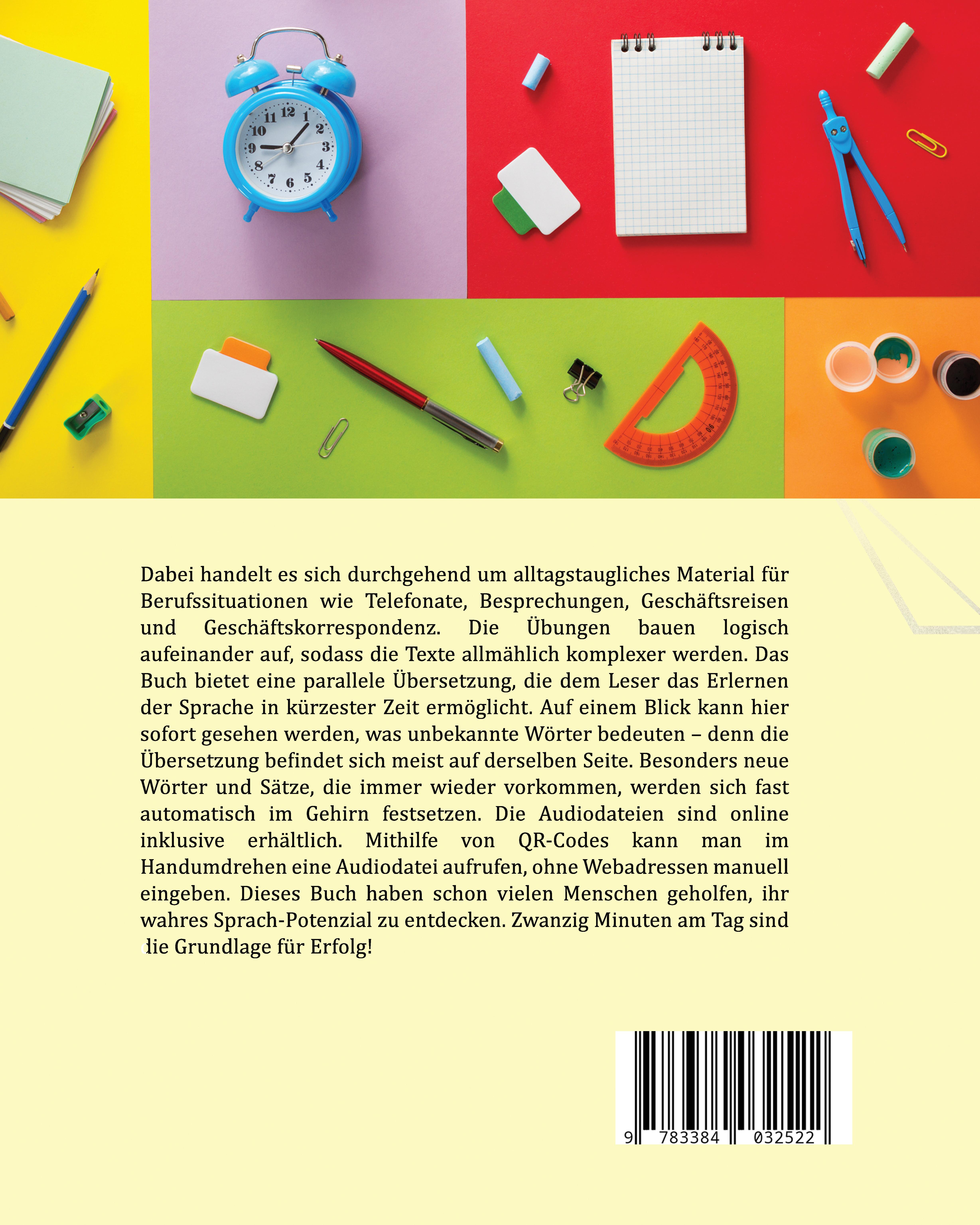 Dabei handelt es sich durchgehend um alltagstaugliches Material für Berufssituationen wie Telefonate, Besprechungen, Geschäftsreisen und Geschäftskorrespondenz. Die Übungen bauen logisch aufeinander auf, sodass die Texte allmählich komplexer werden. Das Buch bietet eine parallele Übersetzung, die dem Leser das Erlernen der Sprache in kürzester Zeit ermöglicht. Auf einem Blick kann hier sofort gesehen werden, was unbekannte Wörter bedeuten - denn die Übersetzung befindet sich meist auf derselben Seite. Besonders neue Wörter und Sätze, die immer wieder vorkommen, werden sich fast automatisch im Gehirn festsetzen. Die Audiodateien sind online inklusive erhältlich. Mithilfe von QR-Codes kann man im Handumdrehen eine Audiodatei aufrufen, ohne Webadressen manuell eingeben. Dieses Buch haben schon vielen Menschen geholfen, ihr wahres Sprach-Potenzial zu entdecken. Zwanzig Minuten am Tag sind die Grundlage für Erfolg!