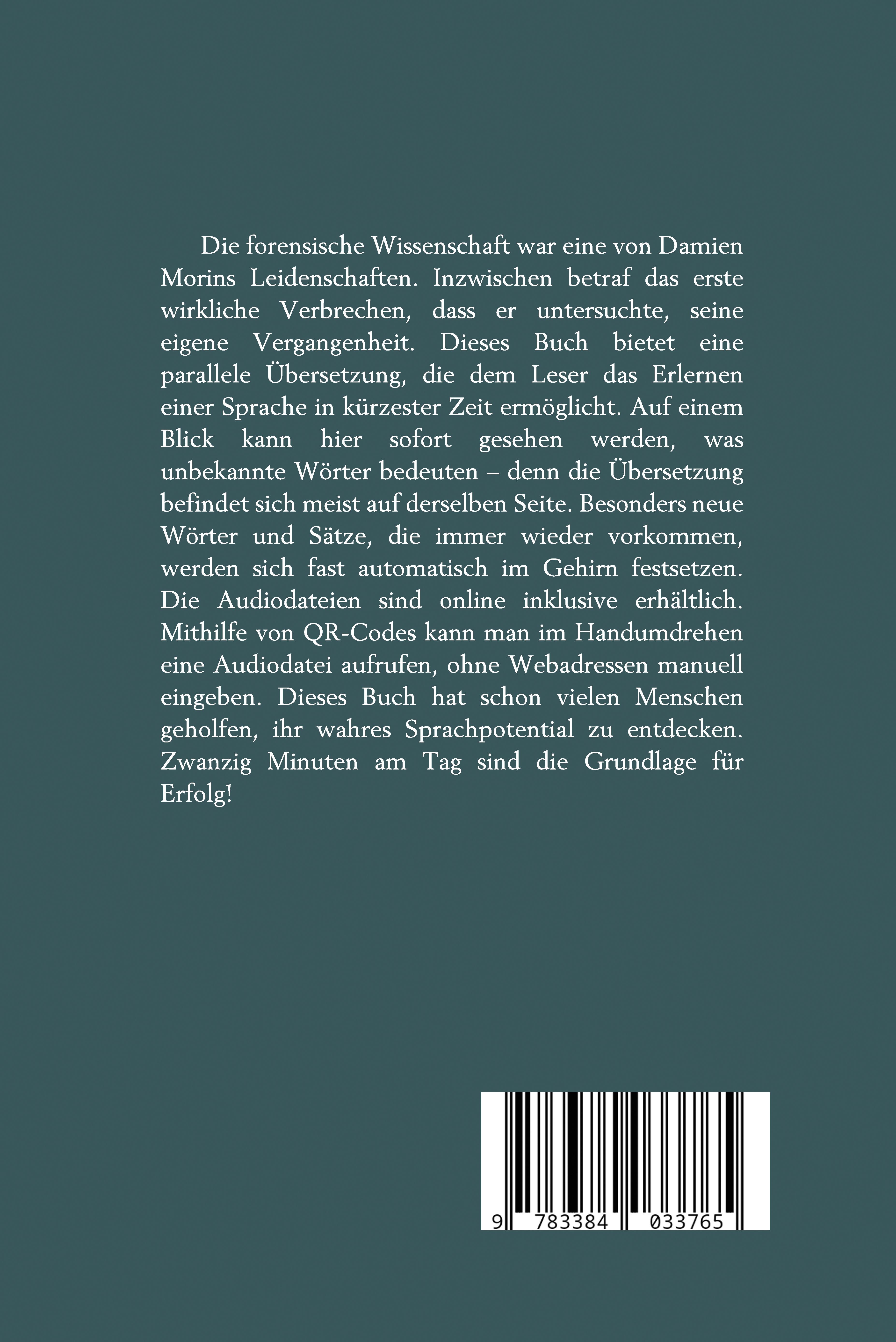 Die forensische Wissenschaft war eine von Damien Morins Leidenschaften. Inzwischen betraf das erste wirkliche Verbrechen, dass er untersuchte, seine eigene Vergangenheit. Dieses Buch bietet eine parallele Übersetzung, die dem Leser das Erlernen einer Sprache in kürzester Zeit ermöglicht. Auf einem Blick kann hier sofort gesehen werden, was unbekannte Wörter bedeuten - denn die Übersetzung befindet sich meist auf derselben Seite. Besonders neue Wörter und Sätze, die immer wieder vorkommen, werden sich fast automatisch im Gehirn festsetzen. Die Audiodateien sind online inklusive erhältlich. Mithilfe von QR-Codes kann man im Handumdrehen eine Audiodatei aufrufen, ohne Webadressen manuell eingeben. Dieses Buch hat schon vielen Menschen geholfen, ihr wahres Sprachpotential zu entdecken. Zwanzig Minuten am Tag sind die Grundlage für Erfolg!