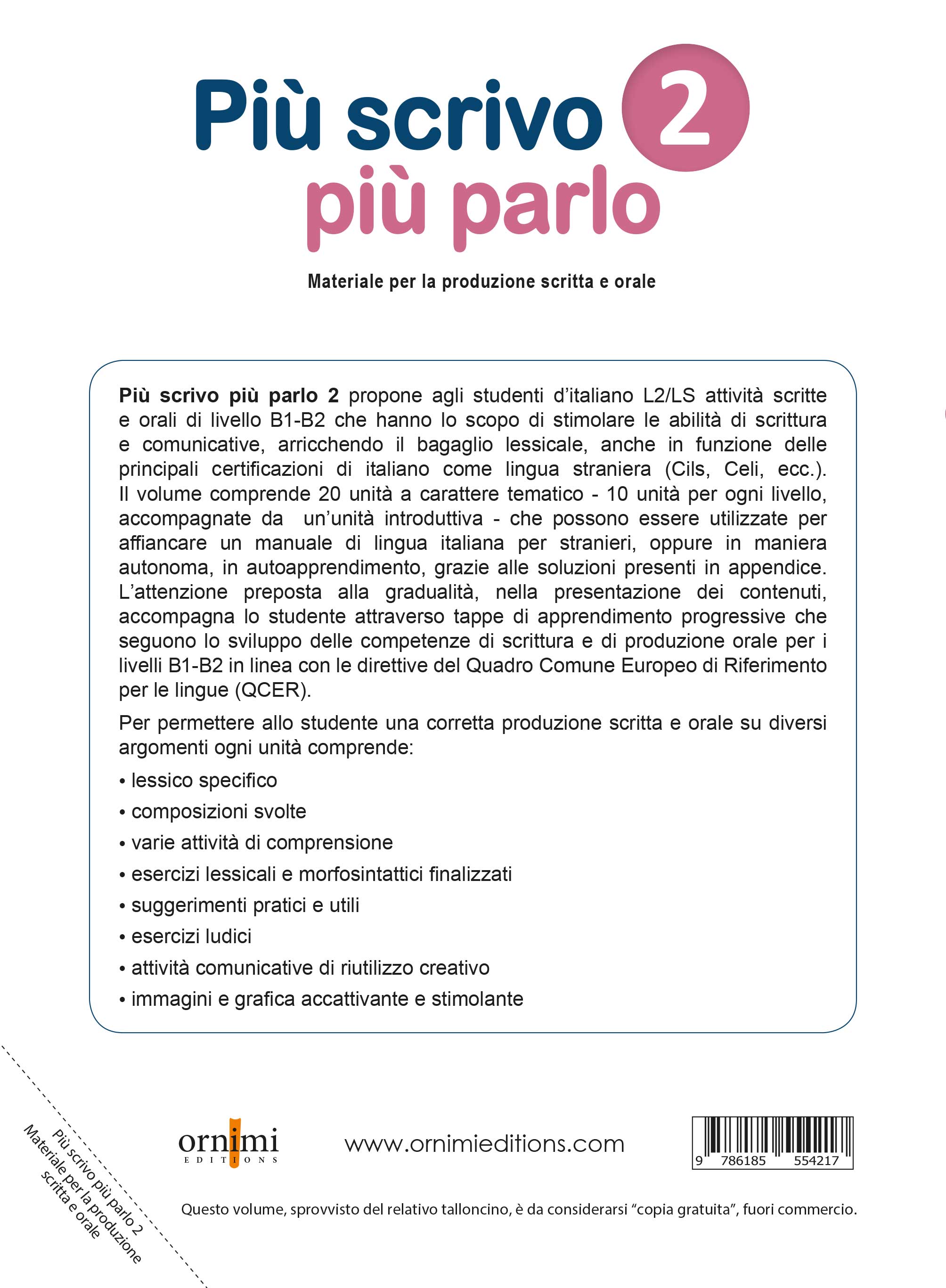 Più scrivo più parlo 2 von Ornimi Editions richtet sich an Lernende der italienischen Sprache auf den Niveaustufen B1-B2 und ist ideal für diejenigen, die die notwendigen Fähigkeiten in der schriftlichen und mündlichen Produktion entwickeln und/oder sich auf eine Zertifizierungsprüfung (Celi, Cils, Plida, etc.) vorbereiten möchten. Das Buch enthält 20 thematische Einheiten, 10 Einheiten für jedes Niveau, begleitet von einer einführenden Einheit, die als Begleitmaterial zu einem Lehrbuch oder auch dank der Lösungen im Anhang zum Selbststudium verwendet werden können. Das Ziel dieses Buches darin, durch Schreibübungen zum Nachdenken über die Sprache anzuregen. Der Lernende wird angeleitet, seine Gedanken klar und kohärent zu strukturieren und sich in alltäglichen kommunikativen Kontexten fließend und ohne Zögern auszudrücken.