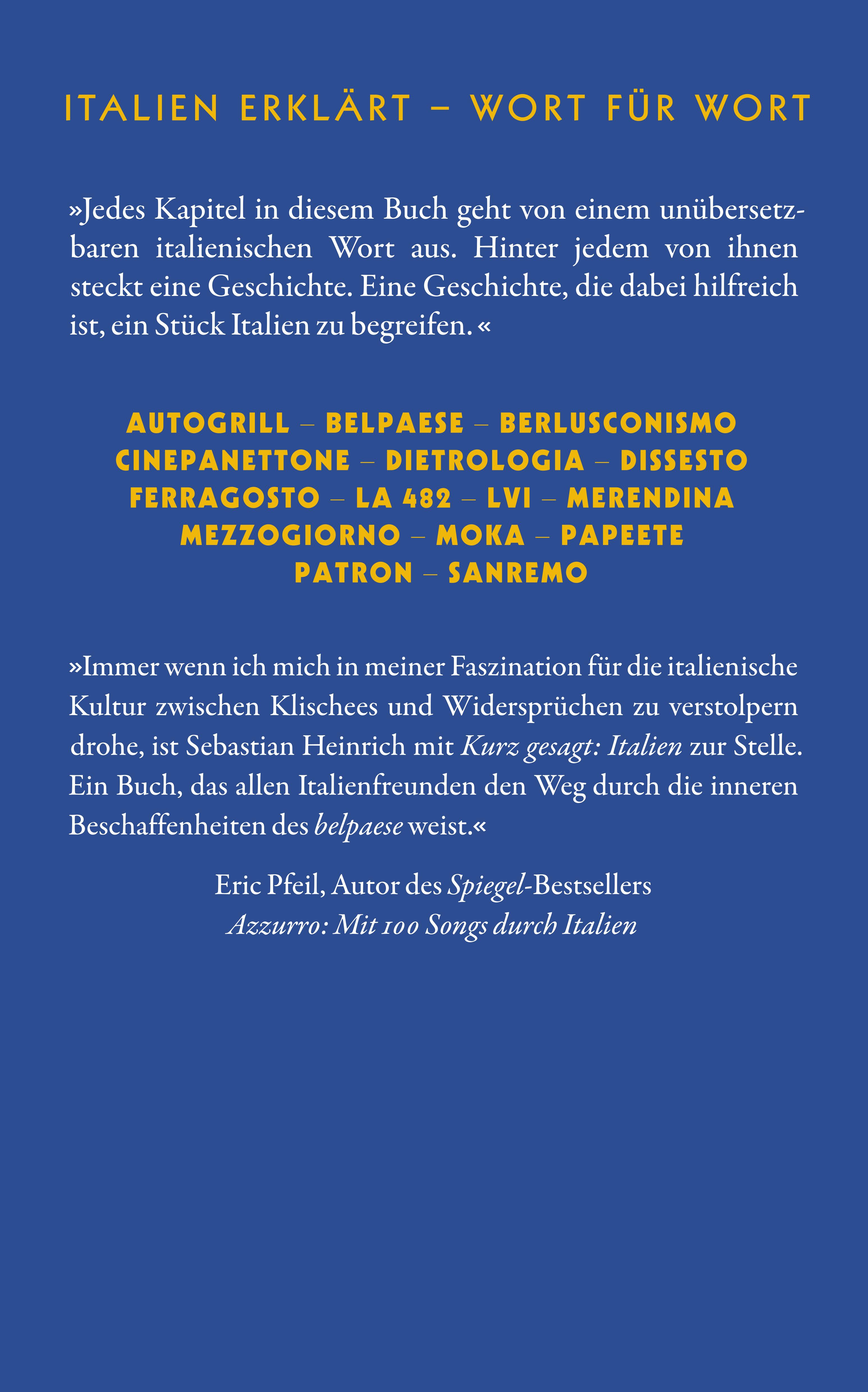 Sebastian Heinrich lädt uns ein, hinter die Klischees zu schauen. Anhand einzelner, unübersetzbarer Begriffe bringt er uns das Land Wort für Wort ein Stückchen näher: von den herrlich kitschigen cinepanettoni, die an Weihnachten im Fernsehen laufen, über den berlusconismo bis hin zu papeete und der Frage, warum in Rom eigentlich so oft die Regierung stürzt. Er erklärt, warum der Norden über den Süden die Nase rümpft - und umgekehrt - und weshalb die Städte an ferragosto in einen tiefen Sommerschlaf verfallen. Ein Handwörterbuch für alle Italianità-Liebhaber!