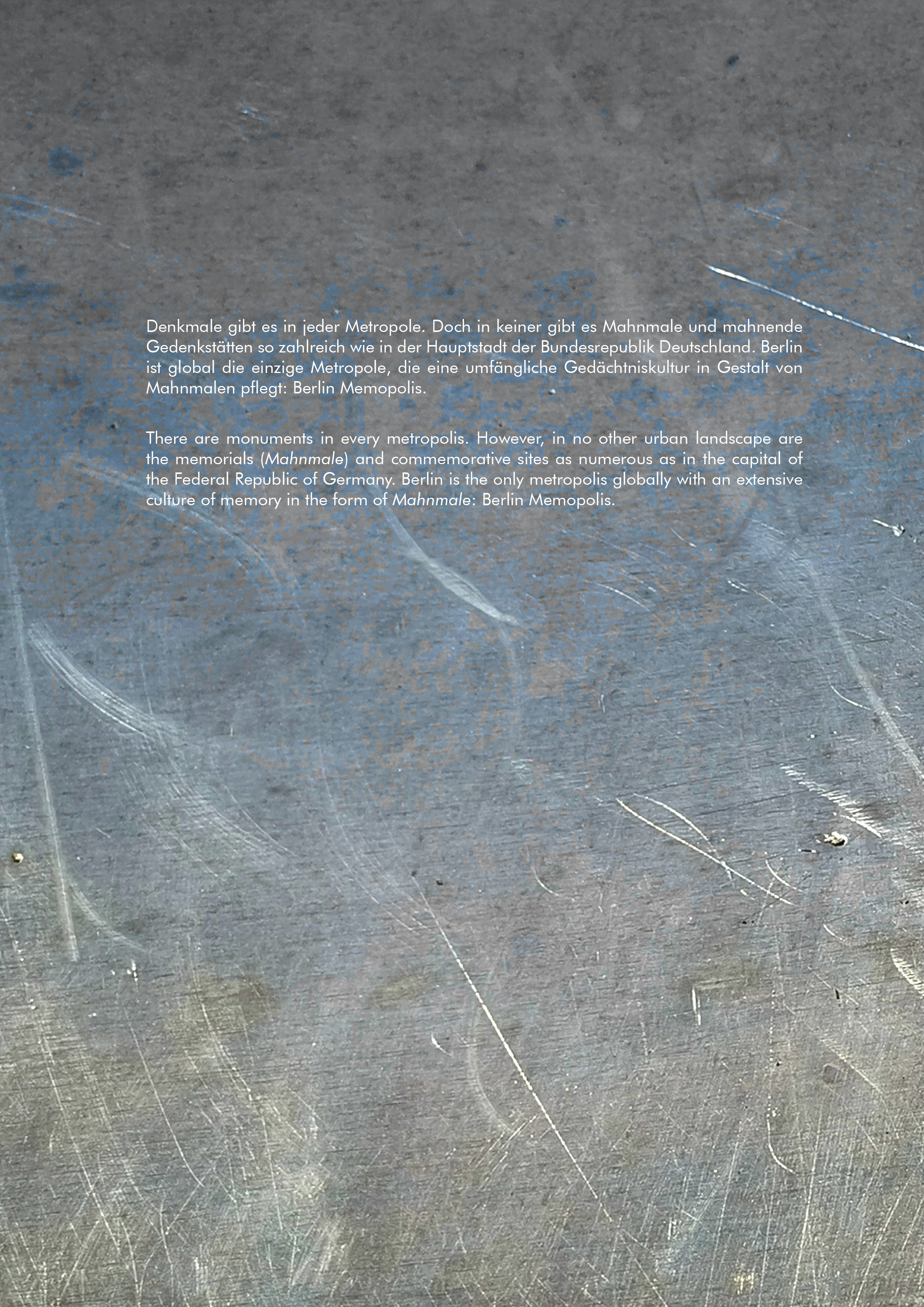 Denkmale gibt es in jeder Metropole. Doch in keiner gibt es Mahnmale und mahnende Gedänkstätten so zahlreich wie in der Hauptstadt der Bundesrepublik Deutschland. Berlin ist global die einzige Metropole, die eine umfängliche Gedächtniskultur in Gestalt von Mahnmalen pflegt: Berlin Memopolis.There are monuments in every metropolis. However, in no other urban landscape are the memoriels (Mahnmale) and commemorative sites as numerous as in the capital of the Federal Republic of Germany. Berlin is the only metropolis globally with an extensive culture of memory in the form of Mahnmale: Berlin Memopolis.