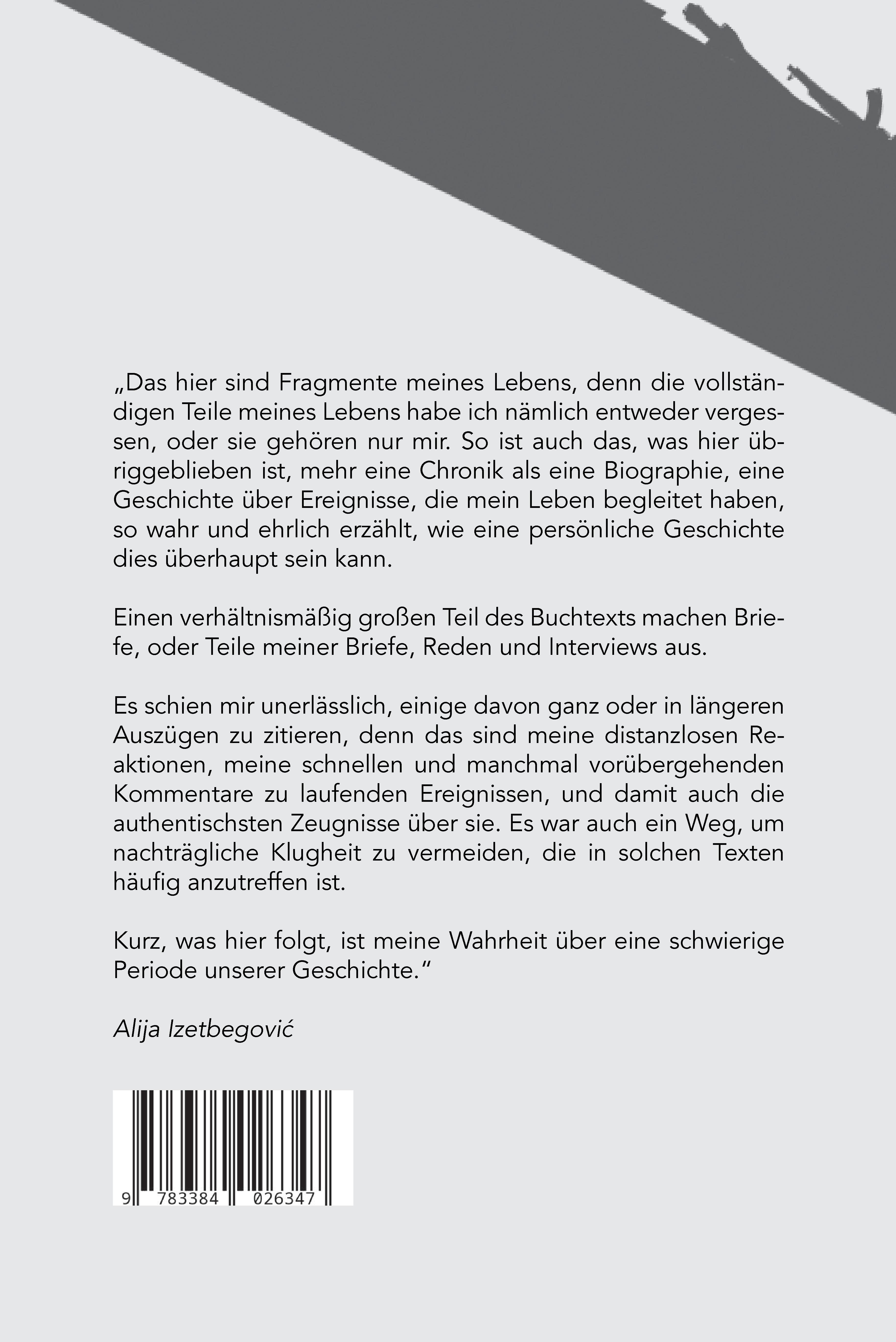 Das hier sind Fragmente meines Lebens, denn die vollständigen Teile meines Lebens habe ich nämlich entweder vergessen, oder sie gehören nur mir. So ist auch das, was hier übriggeblieben ist, mehr eine Chronik als eine Biographie, eine Geschichte über Ereignisse, die mein Leben begleitet haben, so wahr und ehrlich erzählt, wie eine persönliche Geschichte dies überhaupt sein kann.Einen verhältnismäßig großen Teil des Buchtexts machen Briefe, oder Teile meiner Briefe, Reden und Interviews aus.Es schien mir unerlässlich, einige davon ganz oder in längeren Auszügen zu zitieren, denn das sind meine distanzlosen Reaktionen, meine schnellen und manchmal vorübergehenden Kommentare zu laufenden Ereignissen, und damit auch die authentischsten Zeugnisse über sie. Es war auch ein Weg, um nachträgliche Klugheit zu vermeiden, die in solchen Texten häufig anzutreffen ist.Kurz, was hier folgt, ist meine Wahrheit über eine schwierige Periode unserer Geschichte.Alija Izetbegovic