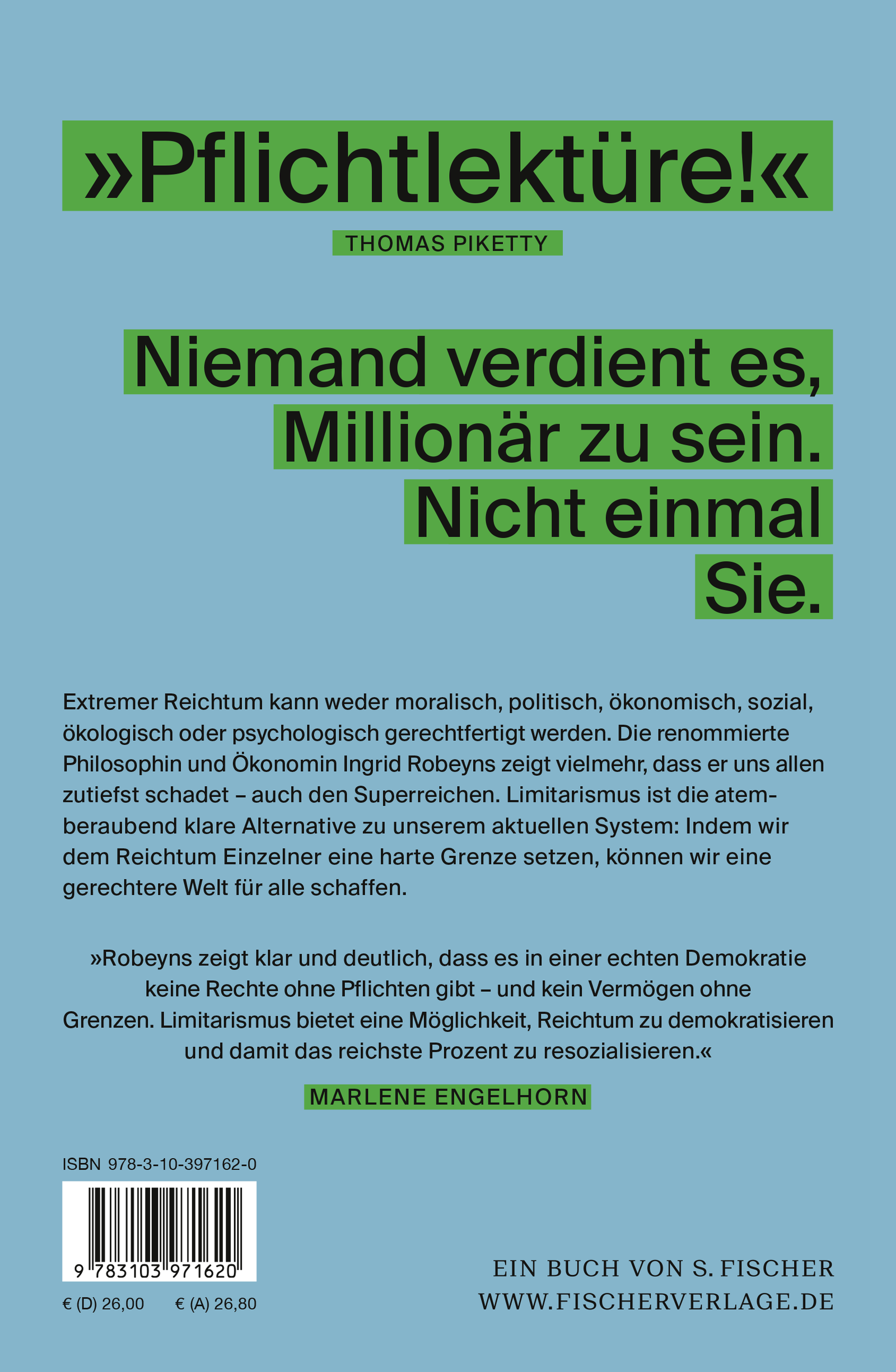 »Robeyns zeigt klar und deutlich, dass es in einer echten Demokratie keine Rechte ohne Pflichten gibt – und kein Vermögen ohne Grenzen. Limitarismus bietet eine Möglichkeit, Reichtum zu demokratisieren und damit das reichste Prozent zu resozialisieren.« Marlene Engelhorn, Autorin von »Geld« und Mitgründerin von taxmenow