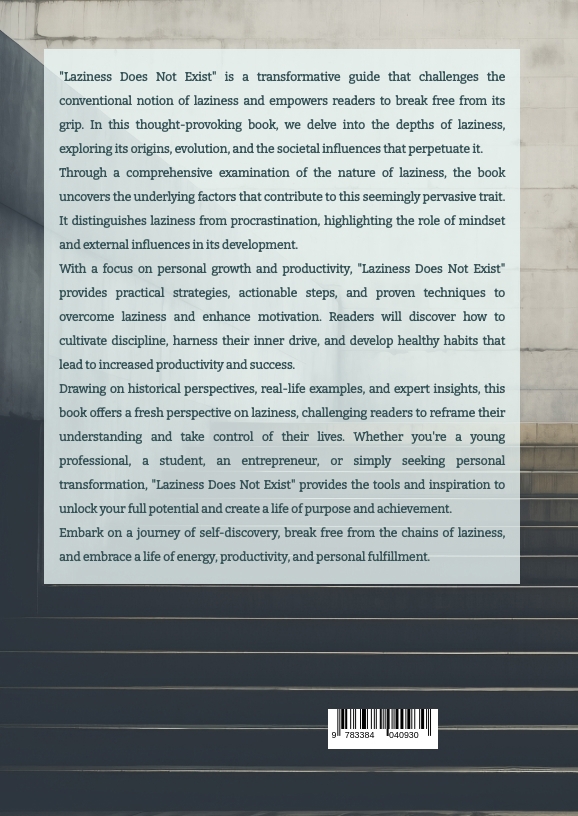 "Laziness Does Not Exist" is a transformative guide that challenges the conventional notion of laziness and empowers readers to break free from its grip. In this thought-provoking book, we delve into the depths of laziness, exploring its origins, evolution, and the societal influences that perpetuate it.Through a comprehensive examination of the nature of laziness, the book uncovers the underlying factors that contribute to this seemingly pervasive trait. It distinguishes laziness from procrastination, highlighting the role of mindset and external influences in its development.With a focus on personal growth and productivity, "Laziness Does Not Exist" provides practical strategies, actionable steps, and proven techniques to overcome laziness and enhance motivation. Readers will discover how to cultivate discipline, harness their inner drive, and develop healthy habits that lead to increased productivity and success.Drawing on historical perspectives, real-life examples, and expert insights, this book offers a fresh perspective on laziness, challenging readers to reframe their understanding and take control of their lives. Whether you're a young professional, a student, an entrepreneur, or simply seeking personal transformation, "Laziness Does Not Exist" provides the tools and inspiration to unlock your full potential and create a life of purpose and achievement.Embark on a journey of self-discovery, break free from the chains of laziness, and embrace a life of energy, productivity, and personal fulfillment.