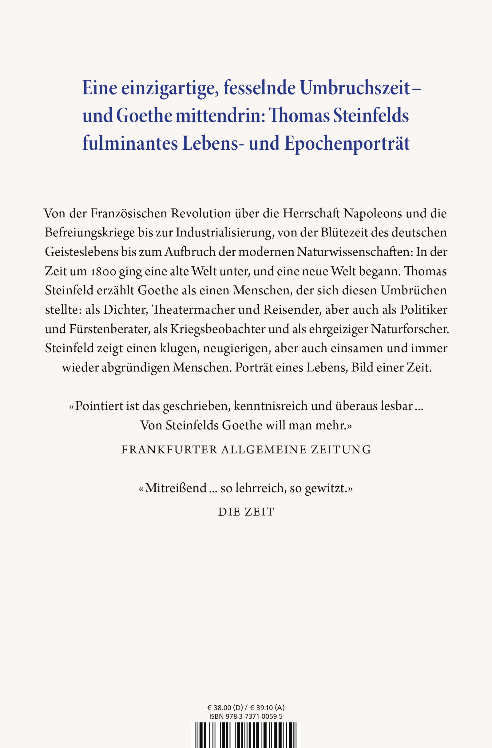 Als Goethe im Jahr 1832 starb, hatten die Französische Revolution, die Napoleonischen Kriege und die Industrialisierung Europa von Grund auf verändert. Thomas Steinfeld erzählt Goethe neu – als einen Menschen, in dessen Leben und Werk sich die Umbrüche jener Zeit auf einzigartige Weise spiegeln: beginnend mit der Kindheit in Frankfurt und den Studienjahren in Leipzig und Straßburg, über die Phase des poetischen Aufbruchs bis hin zum »Faust«, zur »Farbenlehre« und zum »West-östlichen Divan«. Auch das Herzogtum Sachsen-Weimar rückt in ein neues Licht, als eine intellektuelle Landschaft von großer Bedeutung für die Philosophie, die Medizin oder die Physik. Goethe tritt in den vertrauten Rollen des Dichters, Theatermachers oder Reisenden auf, aber auch in den weniger bekannten des Politikers, Kriegsbeobachters und Naturforschers. Steinfeld zeichnet das Bild eines Intellektuellen, der nichts schreiben konnte, ohne zugleich das Gegenteil zu denken, eines Konservativen, der sich stets auf der Höhe der Zeit befand – und eines klugen, neugierigen, aber auch einsamen Menschen, der einige der schönsten und tiefsten Werke schrieb, die es in der deutschen Literatur gibt.