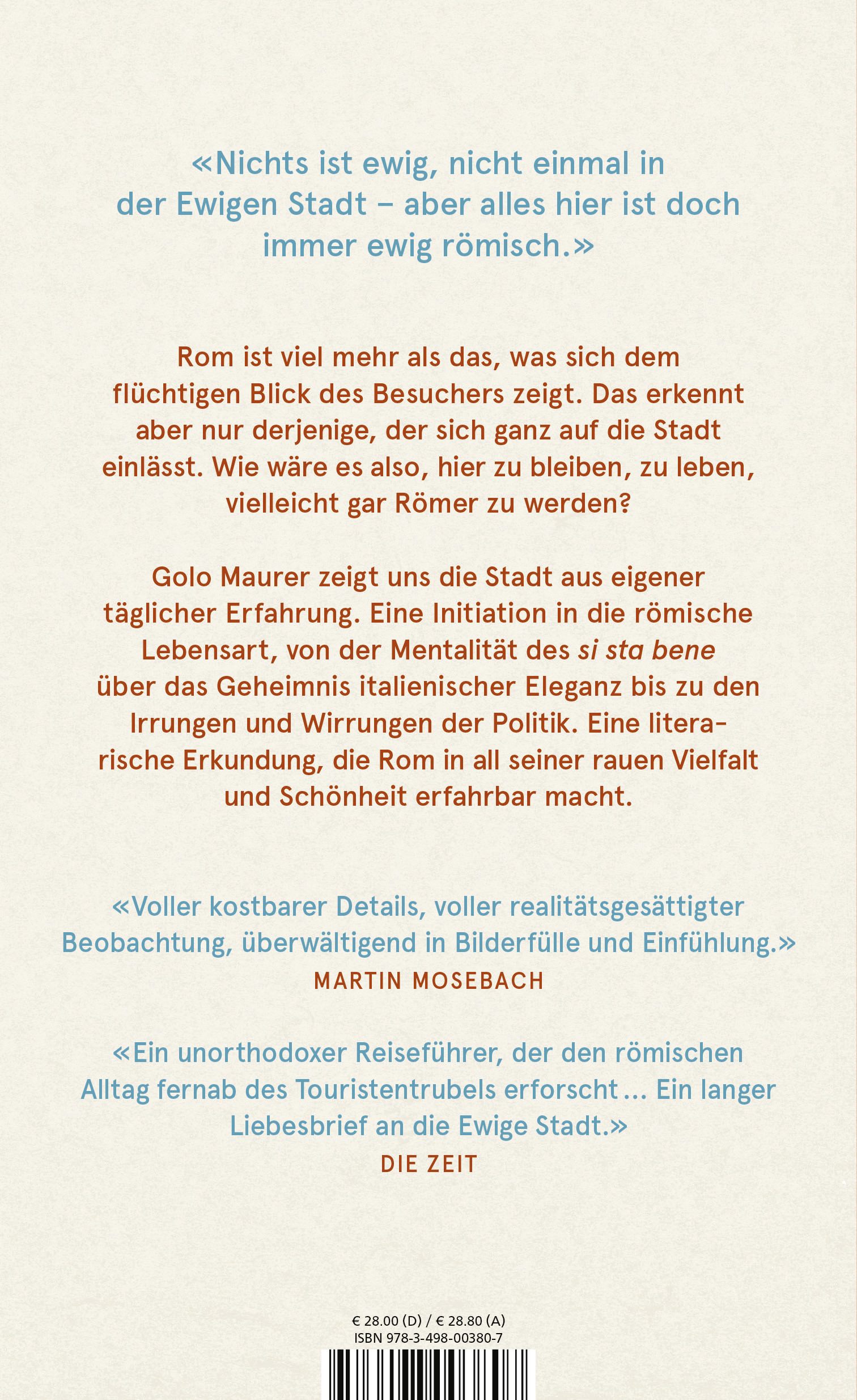 Schön ist es, von Rom zu träumen - aber wie wäre es, dort zu leben? Golo Maurer hat sich genau dazu entschlossen, und er zeigt die Stadt und das römische Leben, fern touristischer Pfade und aus eigener täglicher Erfahrung. Dabei führt der Weg durch sämtliche quartieri und über die berühmten sieben Hügel, am Tiber entlang und ins Gewimmel der Gassen. Was Zugezogene wissen sollten: dass casa weder nur «Wohnung» noch notwendig «Haus» bedeutet; worauf zu achten ist, damit die Spaghetti Vongole so betörend schmecken, wie sie es hier im besten Fall tun; was man über die italienische Politik erfährt, wenn man dem Taxifahrer aufmerksam lauscht. Und damit beginnt schon die Initiation in die römische Lebensart, zu der die Kunst des Fluchens ebenso gehört wie das si sta bene, das die Mentalität der Italiener auf unvergleichliche Weise ausdrückt.