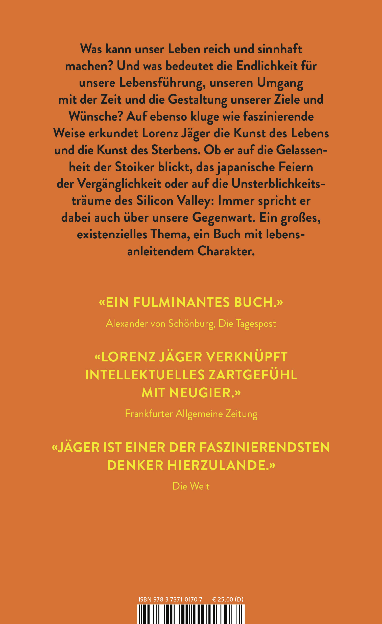 Was kann unser Leben reich und sinnhaft machen? Und was bedeutet die Endlichkeit für unsere Lebensführung, unseren Umgang mit der Zeit und die Gestaltung unserer Ziele und Wünsche? – Das Buch von Lorenz Jäger hat lebensanleitenden Charakter.