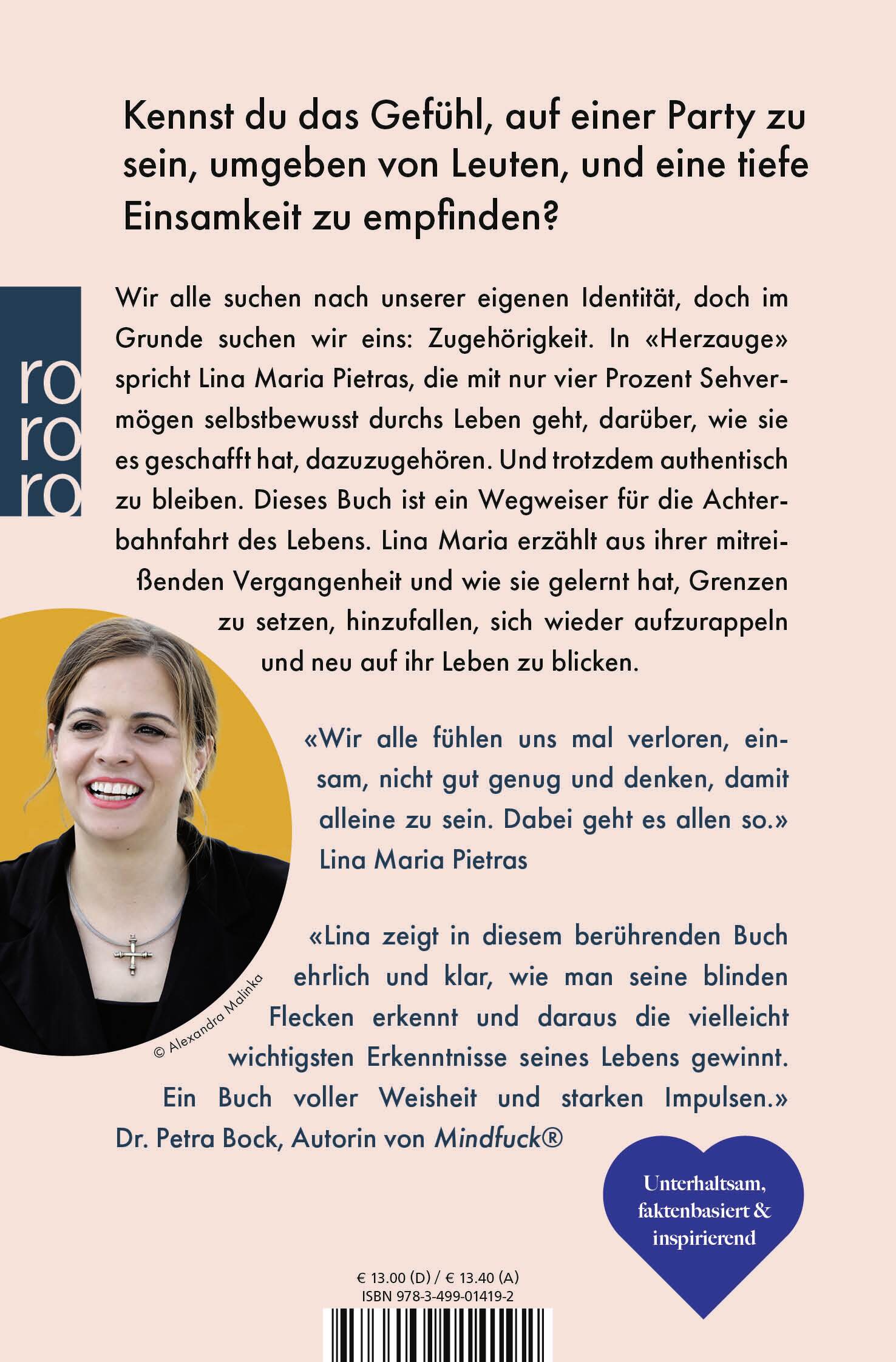 Im Alltag betäuben wir uns zunehmend mit unterschiedlichsten Aktivitäten und entfernen uns so mehr und mehr von uns selbst. Selbstzweifel und innere Kritiker haben da leichtes Spiel. Lina Maria Pietras zeigt uns in ihrem Buch, dass man sich nur in sich selbst und nicht im Außen finden kann und dass das Sehen mit dem Herzen viel wichtiger ist als das Sehen mit den Augen. Sie selbst geht mit nur vier Prozent Sehvermögen selbstbewusst und selbstbestimmt durchs Leben. Sie lebt Inklusion und hilft anderen als Coach, ebenfalls mehr auf die eigenen Bedürfnisse zu hören, als der Anerkennung von außen nachzueifern. Gleichzeitig zeigt die Autorin auf beeindruckende Weise, dass Selbstfindung und Druck keine guten Partner sind - in «Herzauge» erfahren wir, wie es mit Leichtigkeit gelingt, Strategien für schlechte Zeiten zu entwickeln, gesunde Beziehungen aufzubauen, sich selbst wieder mehr zu lieben und nicht zu streng mit sich zu sein.