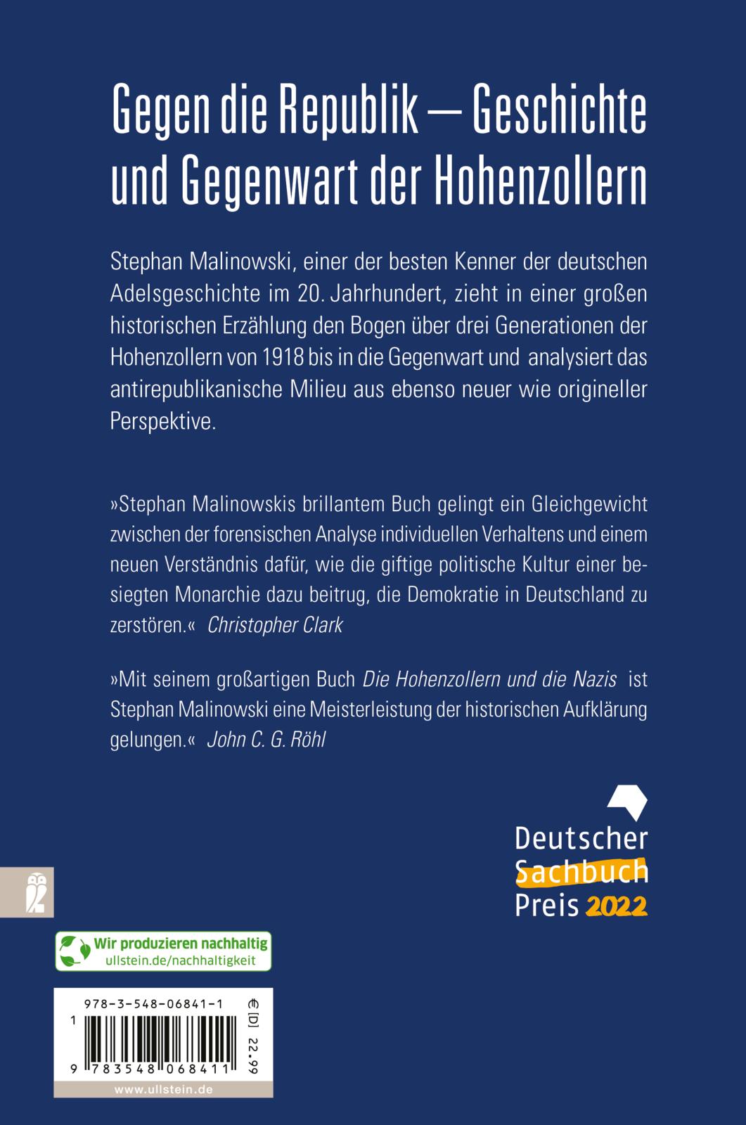 »Stephan Malinowskis brillantem Buch gelingt ein Gleichgewicht zwischen der forensischen Analyse individuellen Verhaltens und einem neuen Verständnis dafür, wie die giftige politische Kultur einer besiegten Monarchie dazu beitrug, die Demokratie in Deutschland zu zerstören.« Christopher Clark Die Zeit 20211007