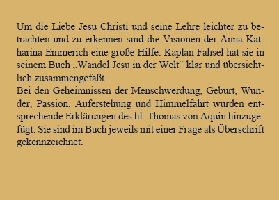Um die Liebe Jesu Christi und sein Lehren leichter zu betrachten und zu erkennen sind die Visionen der Anna Katharina Emmerich eine große Hilfe. Kaplan Fahsel hat sie in seinem Buch „Wandel Jesu in der Welt“ klar und übersichtlich zusammengefaßt.