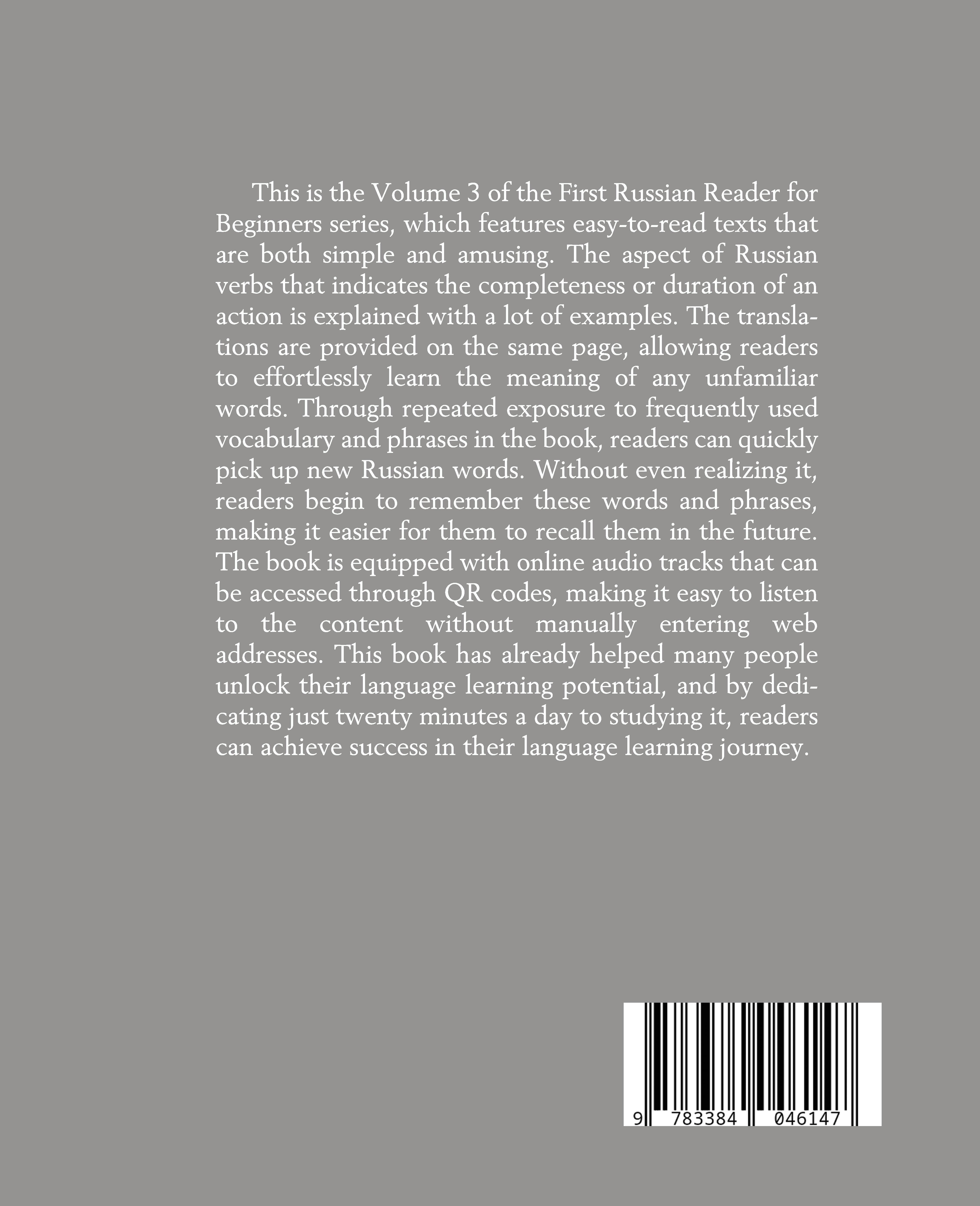 This is the Volume 3 of the First Russian Reader for Beginners series, which features easy-to-read texts that are both simple and amusing. The aspect of Russian verbs that indicates the completeness or duration of an action is explained with a lot of examples. The translations are provided on the same page, allowing readers to effortlessly learn the meaning of any unfamiliar words. Through repeated exposure to frequently used vocabulary and phrases in the book, readers can quickly pick up new Russian words. Without even realizing it, readers begin to remember these words and phrases, making it easier for them to recall them in the future. The book is equipped with online audio tracks that can be accessed through QR codes, making it easy to listen to the content without manually entering web addresses. This book has already helped many people unlock their language learning potential, and by dedicating just twenty minutes a day to studying it, readers can achieve success in their language learning journey.