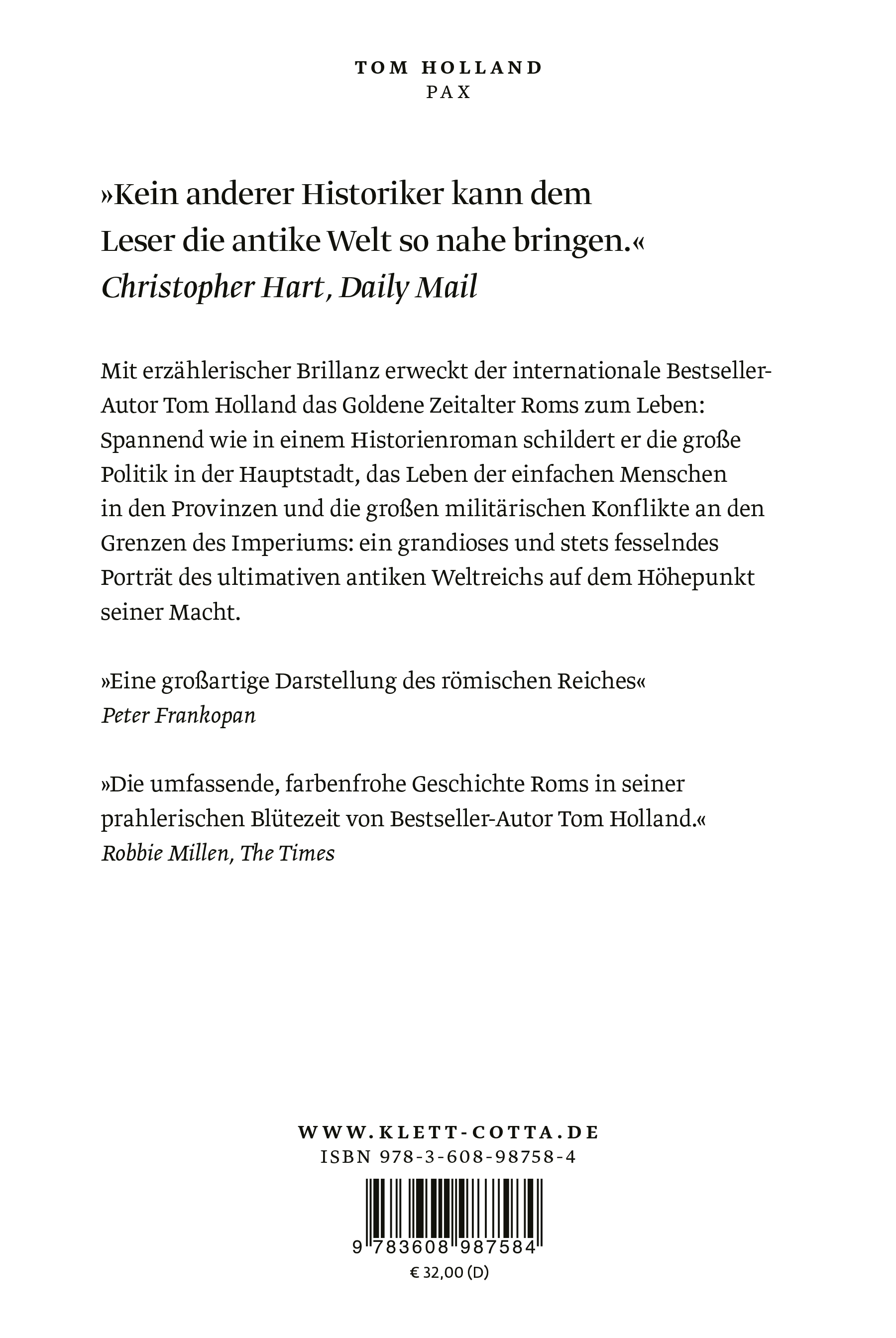 »Tom Holland […] brilliert durch sein Talent, alter Geschichte anekdotenreich neues Leben einzuhauchen.« Ursula Gehriger, Die Weltwoche, 21. Dezember 2023