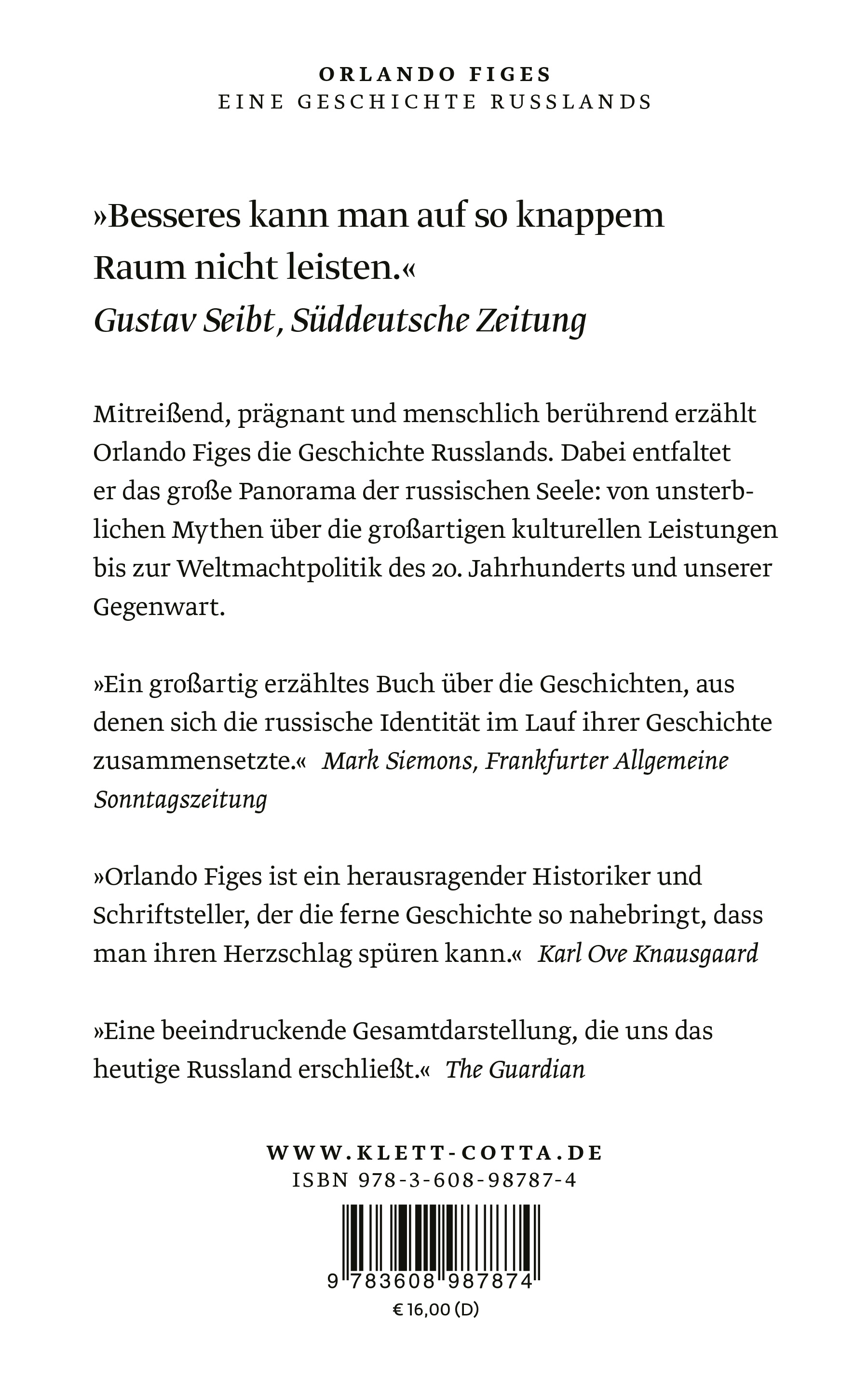 Mitreißend, prägnant und menschlich berührend erzählt Orlando Figes die Geschichte Russlands. Dabei entfaltet er das große Panorama der russischen Seele: von unsterblichen Mythen über die großartigen kulturellen Leistungen bis zur Weltmachtpolitik des 20. Jahrhunderts und unserer Gegenwart.