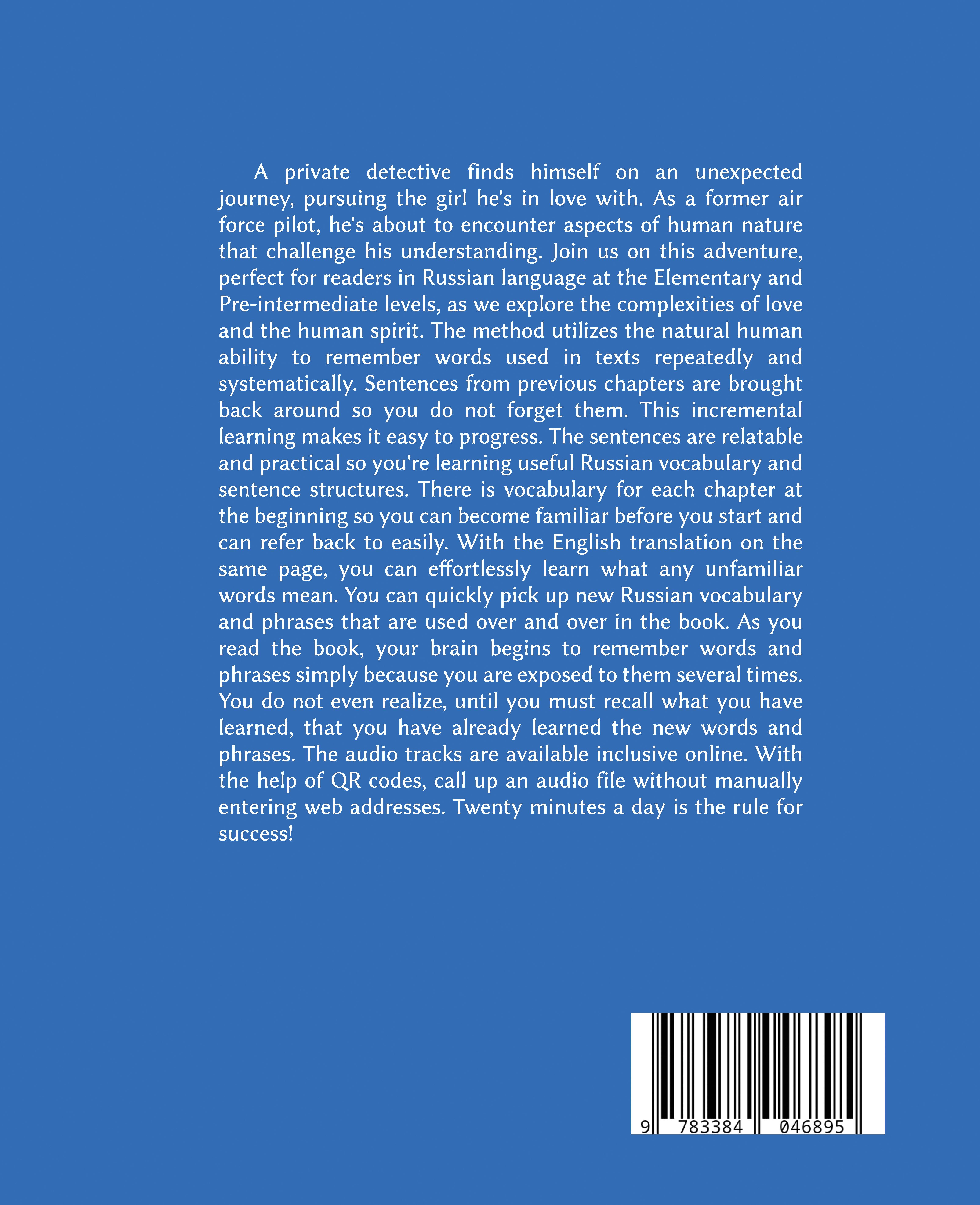 A private detective finds himself on an unexpected journey, pursuing the girl he's in love with. As a former air force pilot, he's about to encounter aspects of human nature that challenge his understanding. Join us on this adventure, perfect for readers in Russian language at the Elementary and Pre-intermediate levels, as we explore the complexities of love and the human spirit. The method utilizes the natural human ability to remember words used in texts repeatedly and systematically. Sentences from previous chapters are brought back around so you do not forget them. This incremental learning makes it easy to progress. The sentences are relatable and practical so you're learning useful Russian vocabulary and sentence structures. There is vocabulary for each chapter at the beginning so you can become familiar before you start and can refer back to easily. With the English translation on the same page, you can effortlessly learn what any unfamiliar words mean. You can quickly pick up new Russian vocabulary and phrases that are used over and over in the book. As you read the book, your brain begins to remember words and phrases simply because you are exposed to them several times. You do not even realize, until you must recall what you have learned, that you have already learned the new words and phrases. The audio tracks are available inclusive online. With the help of QR codes, call up an audio file without manually entering web addresses. Twenty minutes a day is the rule for success!