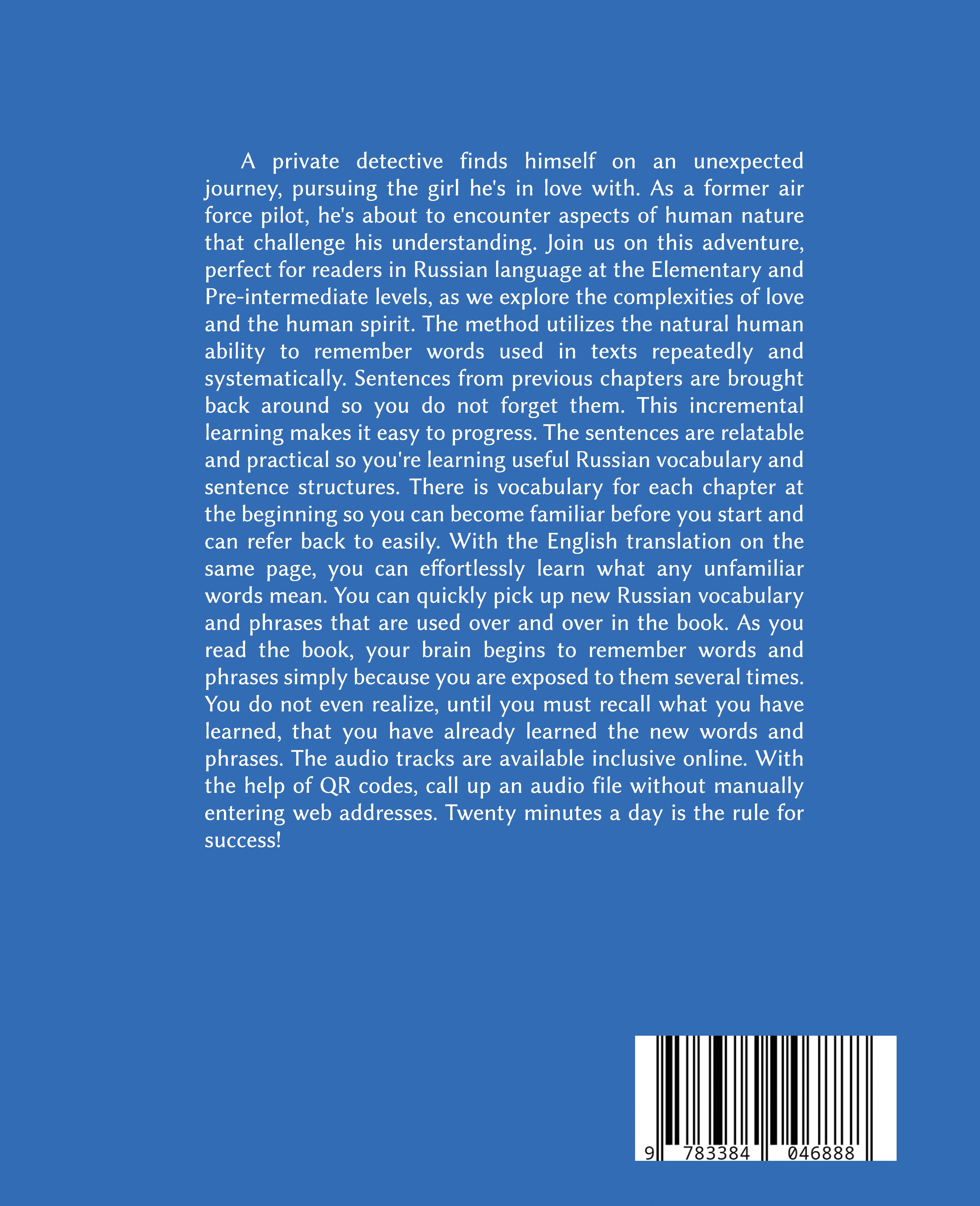 A private detective finds himself on an unexpected journey, pursuing the girl he's in love with. As a former air force pilot, he's about to encounter aspects of human nature that challenge his understanding. Join us on this adventure, perfect for readers in Russian language at the Elementary and Pre-intermediate levels, as we explore the complexities of love and the human spirit. The method utilizes the natural human ability to remember words used in texts repeatedly and systematically. Sentences from previous chapters are brought back around so you do not forget them. This incremental learning makes it easy to progress. The sentences are relatable and practical so you're learning useful Russian vocabulary and sentence structures. There is vocabulary for each chapter at the beginning so you can become familiar before you start and can refer back to easily. With the English translation on the same page, you can effortlessly learn what any unfamiliar words mean. You can quickly pick up new Russian vocabulary and phrases that are used over and over in the book. As you read the book, your brain begins to remember words and phrases simply because you are exposed to them several times. You do not even realize, until you must recall what you have learned, that you have already learned the new words and phrases. The audio tracks are available inclusive online. With the help of QR codes, call up an audio file without manually entering web addresses. Twenty minutes a day is the rule for success!