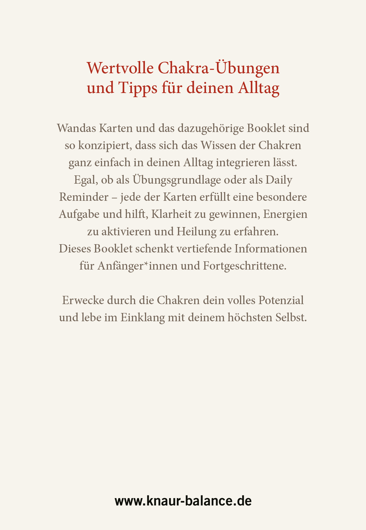 Mit der neuen Kartenbox von der erfolgreichen Yoga-Lehrerin Wanda Badwal wird die faszinierende Welt der Chakren anwendbar gemacht. Jedes unserer sieben Chakren steht für ein bestimmtes Lebensthema wie beispielsweise Vertrauen, Liebe oder Selbstbewusstsein. Die Karten und das dazugehörige Booklet sind so konzipiert, dass sich das Wissen der Chakren ganz einfach in den Alltag integrieren lässt. Egal, ob als Grundlage für Yoga-Übungen oder als Daily Reminder, jede der Karten erfüllt eine besondere Aufgabe und hilft, Klarheit zu gewinnen, Energien zu aktivieren und Heilung zu erfahren.