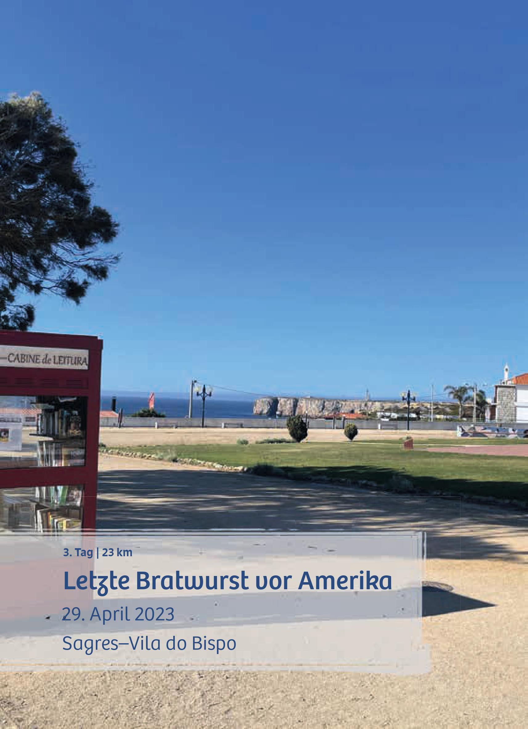 | Schlagworte | Abenteuer • Alentejo • Algarve • Atlantikküste • Auszeit • Fatima • Fernwandern • Fischerpfad • Jakobsweg • Lagos • Lissabon • Marienerscheinung • Nordic Walking • Pilgeralltag • Pilgerort • Reiseabenteuer • Rota Vicentina • Sabbatical • Sonnenwunder • Wahlfahrtsort • Wahlfahrtsstätte • Wallfahrtsort • Wanderreisen • Wanderweg • Weitwandern • Weitwanderwege • Zentralportugal |