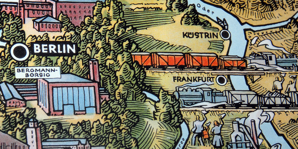und umfangreicher sowjetischer Demontage zu beseitigen. Dabei wurde die Schwerindustrie, Energieerzeugung, chemische Industrie und Maschinenbau aufgebaut und teilweise erweitert. Dadurch wurde die Entwicklung der Konsumgüterindustrie zurückgestellt. Die Planziele wurden trotz vielfältiger Schwierigkeiten meist erreicht. Auf der wunderschönen Karte finden wir die Hauptindustrieprojekte, wie die Volkswerft Stralsund, das Fischkombinat (Zusammenschluss zahlreicher Betriebe) Sassnitz, der Warnow Werft in Warnemünde, der Neptun Werft in Rostock, in Berlin das LEW hans Beimler (Baimler) dem Stahl und Walzwerk Florian dem Nileswerk, Borgmann Borsig, dem Kranbau in Eberswalde dem Stahlwerk in Brendenburg, dem Ernst Thälmann Werk - Karl Liebknecht Werk und dem Karl Marx Werk in Magdeburg, Eisenwerk West in Calbe, dem Werkzeugmaschinenbau in Aschersleben, dem Dampfkesselbau Hohenturm in Dessau, die Leuna Werke Walter Ulbricht, Stahlbau Leipzig, Lauchhammerwerke, Stahl und Walzwerk Gröditz, Eisenhüttenkombinat Ost, Schwermaschinenbau Wildau, Stahl- und Walzwerk in Riesa, Waggonbau Görlitz, Dampfkesselbau Meerane, Maschinenfabrik Union in Gera, Waggonbau in Gotha, Machinenfabrik Nordhausen, Maschinenfabrik Jonny Scheer, Fritz Heckert Werk in Chemnitz, Soso Talsprerre