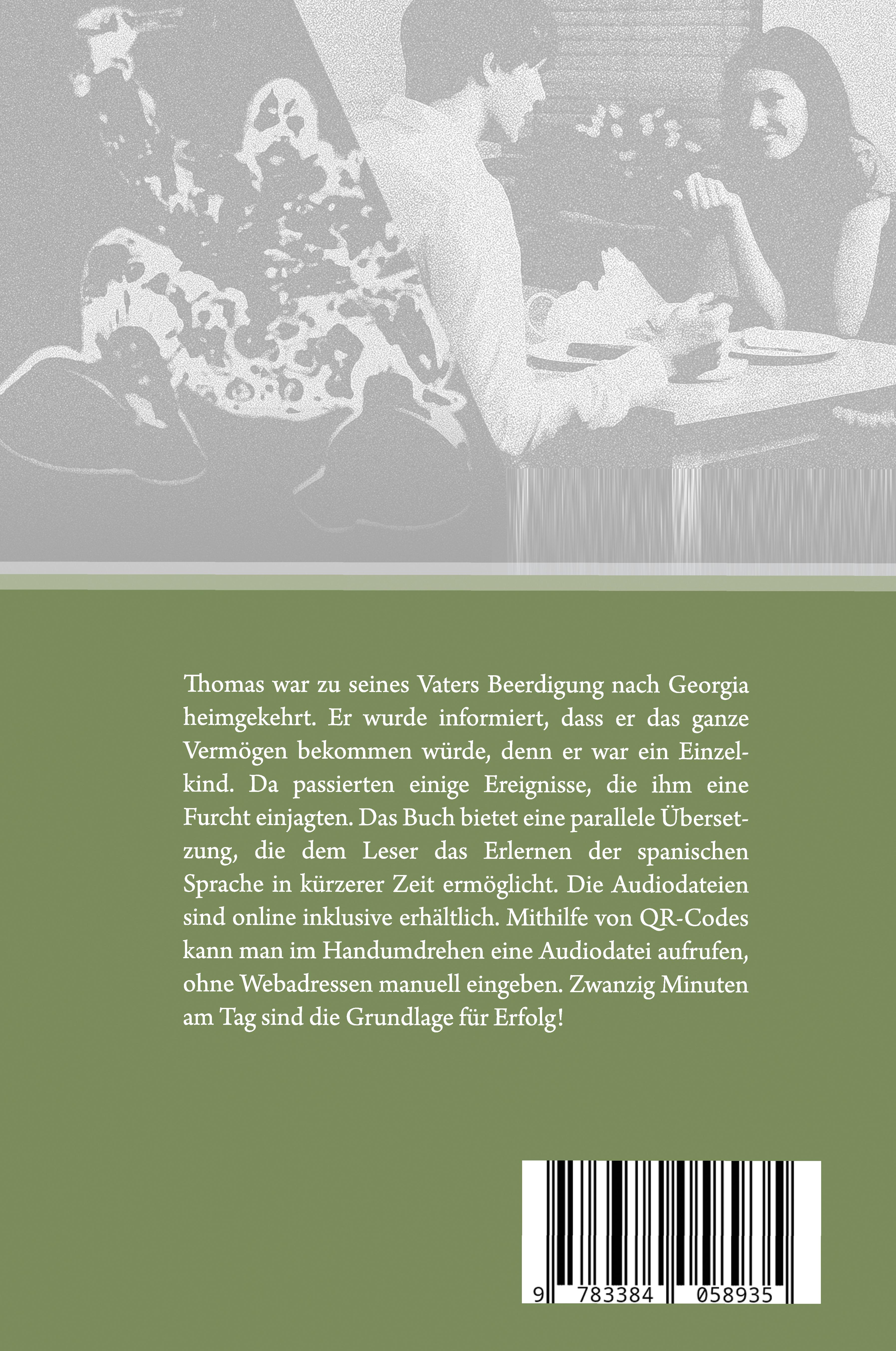 Thomas war zu seines Vaters Beerdigung nach Georgia heimgekehrt. Er wurde informiert, dass er das ganze Vermögen bekommen würde, denn er war ein Einzelkind. Da passierten einige Ereignisse, die ihm eine Furcht einjagten. Das Buch bietet eine parallele Übersetzung, die dem Leser das Erlernen der spanischen Sprache in kürzerer Zeit ermöglicht. Die Audiodateien sind online inklusive erhältlich. Mithilfe von QR-Codes kann man im Handumdrehen eine Audiodatei aufrufen, ohne Webadressen manuell eingeben. Zwanzig Minuten am Tag sind die Grundlage für Erfolg!