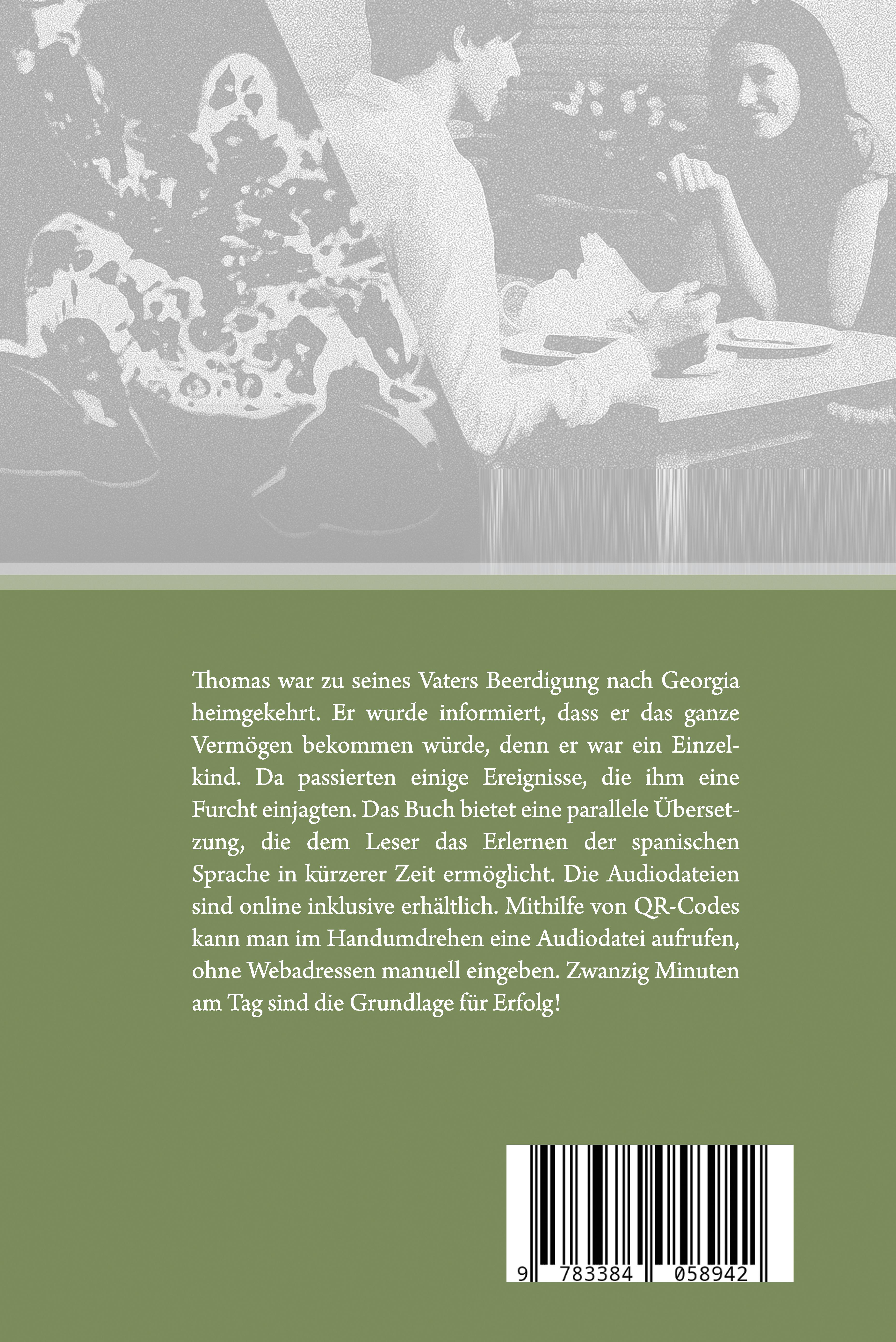 Thomas war zu seines Vaters Beerdigung nach Georgia heimgekehrt. Er wurde informiert, dass er das ganze Vermögen bekommen würde, denn er war ein Einzelkind. Da passierten einige Ereignisse, die ihm eine Furcht einjagten. Das Buch bietet eine parallele Übersetzung, die dem Leser das Erlernen der spanischen Sprache in kürzerer Zeit ermöglicht. Die Audiodateien sind online inklusive erhältlich. Mithilfe von QR-Codes kann man im Handumdrehen eine Audiodatei aufrufen, ohne Webadressen manuell eingeben. Zwanzig Minuten am Tag sind die Grundlage für Erfolg!