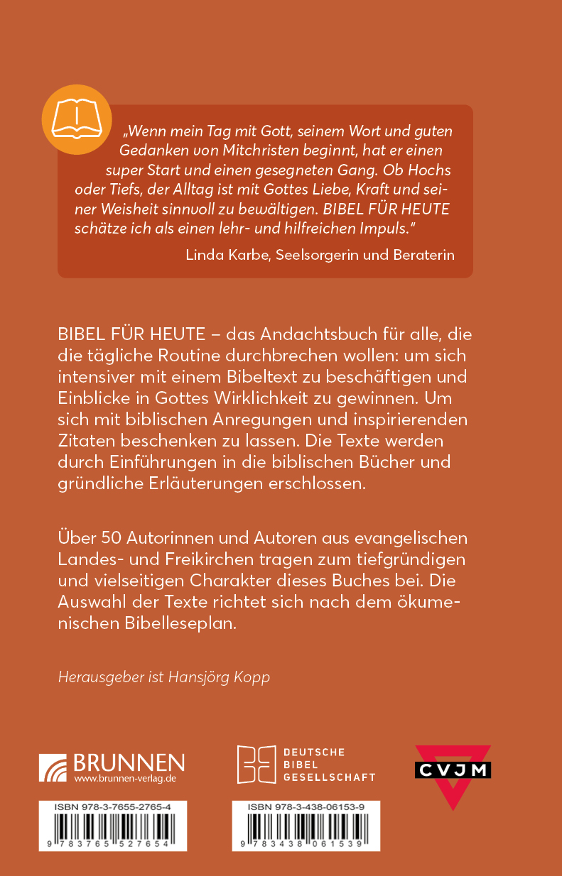 Die Auslegungen richten sich nach dem ökumenischen Bibelleseplan. Impulse, Zitate und Aufgaben regen zum Weiterdenken an. 50 Autorinnen und Autoren aus evangelischen Landes- und Freikirchen tragen zum tiefgründigen und vielseitigen Charakter dieses Buchs bei. Herausgeber ist Hansjörg Kopp und das Buch erscheint in Kooperation mit dem CVJM.