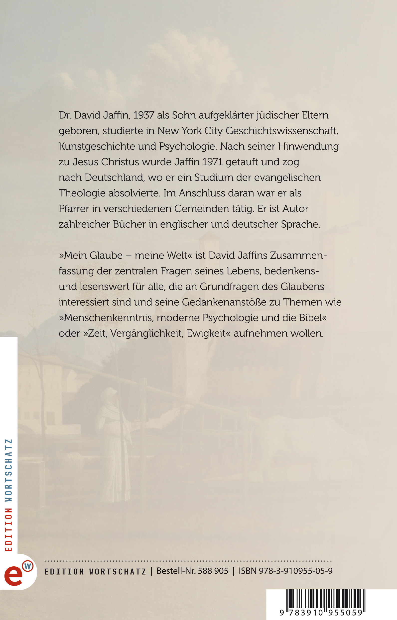 „Mein Glaube – meine Welt“ ist David Jaffins Zusammenfassung der zentralen Fragen seines Lebens, bedenkens- und lesenswert für alle, die an Grundfragen des Glaubens interessiert sind und seine Gedankenanstöße zu Themen wie „Menschenkenntnis, moderne Psychologie und die Bibel“ oder „Zeit, Vergänglichkeit, Ewigkeit" aufnehmen wollen.