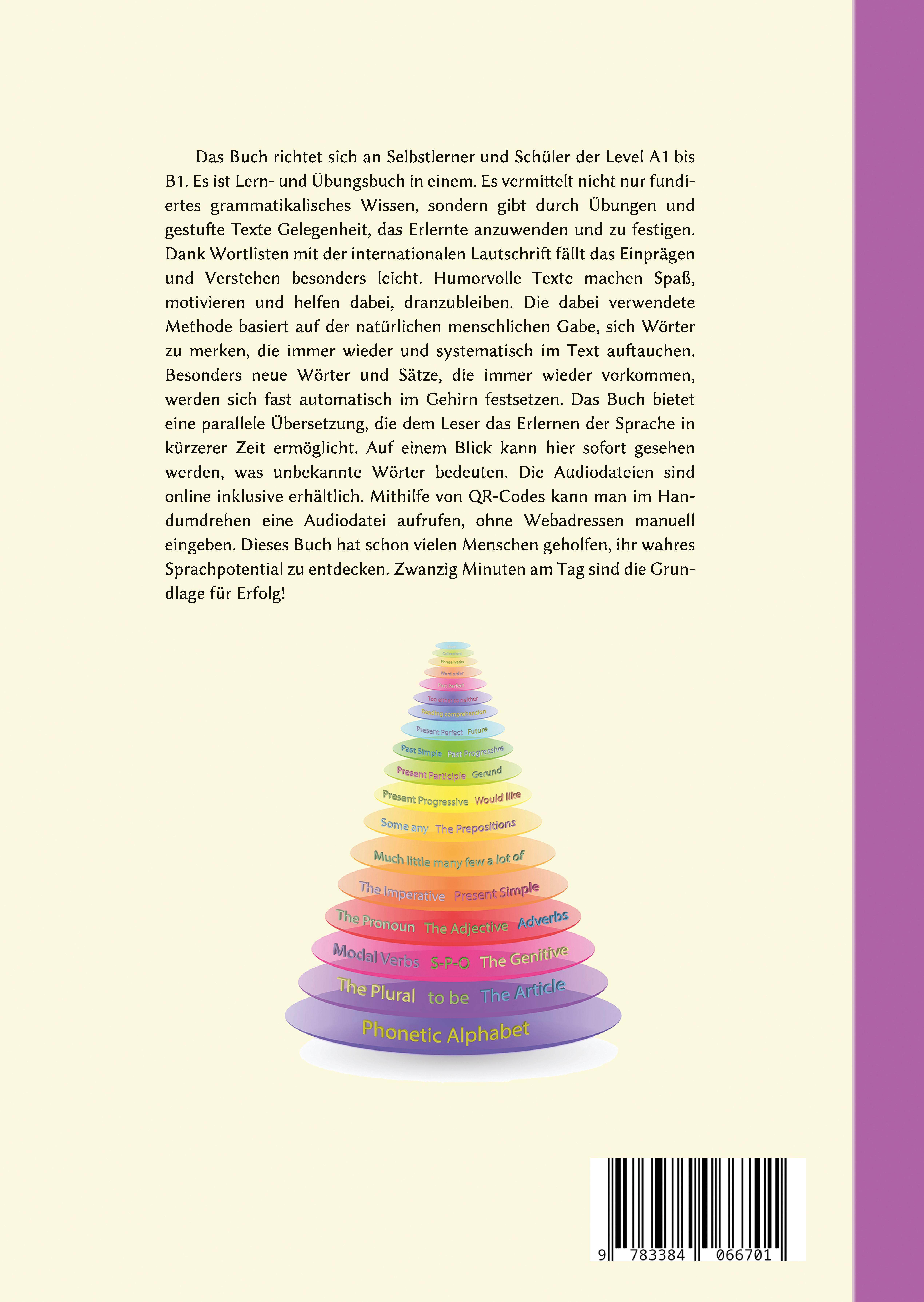 Das Buch richtet sich an Selbstlerner und Schüler der Level A1 bis B1. Es ist Lern- und Übungsbuch in einem. Es vermittelt nicht nur fundiertes grammatikalisches Wissen, sondern gibt durch Übungen und gestufte Texte Gelegenheit, das Erlernte anzuwenden und zu festigen. Dank Wortlisten mit der internationalen Lautschrift fällt das Einprägen und Verstehen besonders leicht. Humorvolle Texte machen Spaß, motivieren und helfen dabei, dranzubleiben. Die dabei verwendete Methode basiert auf der natürlichen menschlichen Gabe, sich Wörter zu merken, die immer wieder und systematisch im Text auftauchen. Besonders neue Wörter und Sätze, die immer wieder vorkommen, werden sich fast automatisch im Gehirn festsetzen. Das Buch bietet eine parallele Übersetzung, die dem Leser das Erlernen der Sprache in kürzerer Zeit ermöglicht. Auf einem Blick kann hier sofort gesehen werden, was unbekannte Wörter bedeuten. Die Audiodateien sind online inklusive erhältlich. Mithilfe von QR-Codes kann man im Handumdrehen eine Audiodatei aufrufen, ohne Webadressen manuell eingeben. Dieses Buch hat schon vielen Menschen geholfen, ihr wahres Sprachpotential zu entdecken. Zwanzig Minuten am Tag sind die Grundlage für Erfolg!