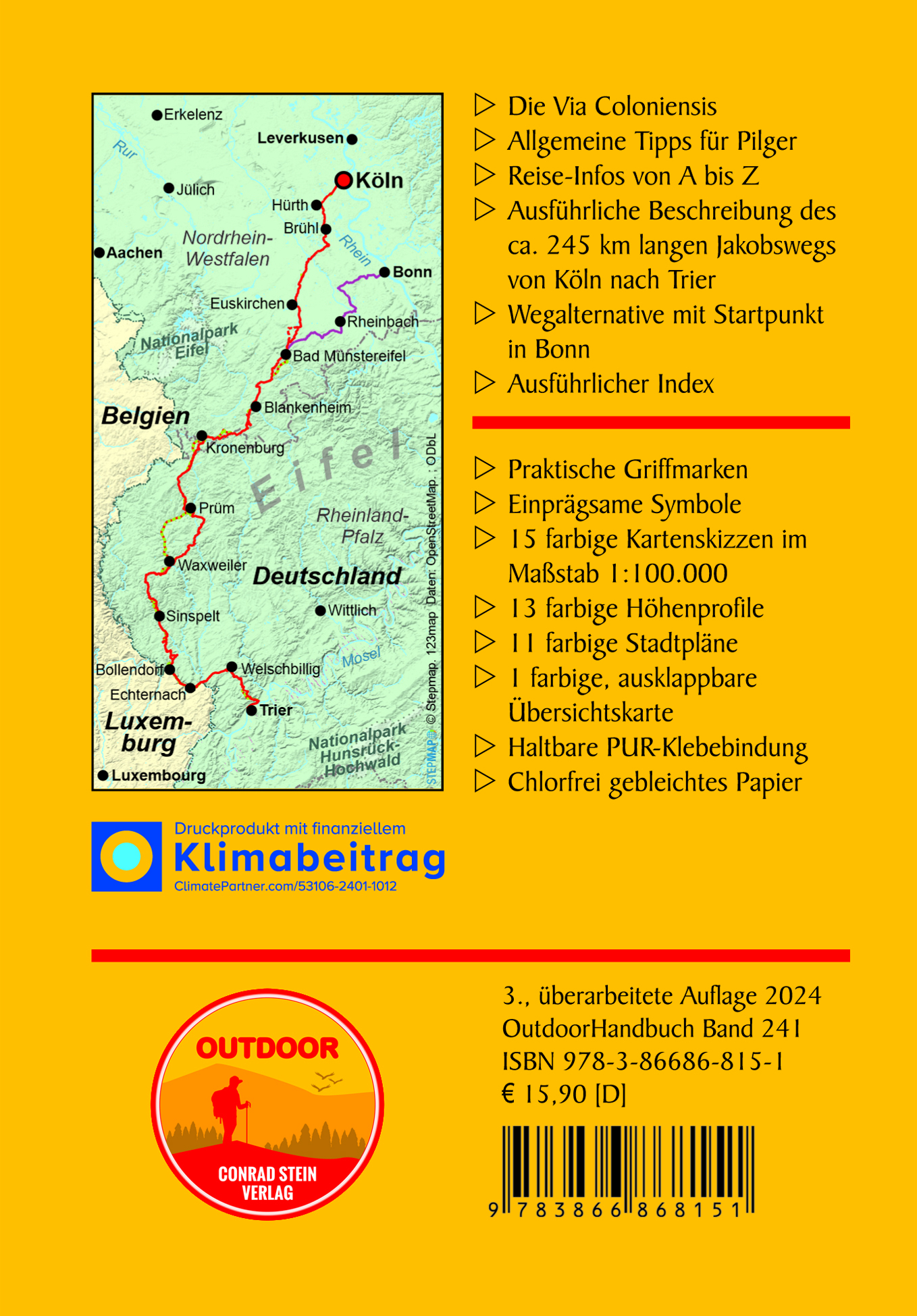 Vorwort, Einleitung, Reise-Infos von A bis Z, Der Jakobsweg ab Köln (3 Etappen), Wegalternative: Der Jakobsweg ab Bonn (2 Etappen), Der weitere Weg nach Trier (11 Etappen), Index.