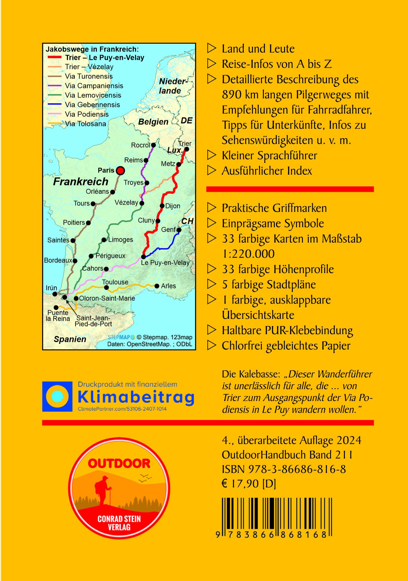 "Dieser Wegführer ist unerlässlich für alle, die zur Zeit von Trier zum Ausgangspunkt der Via Podiensis in Le Puy wandern wollen." (Die Kalebasse)