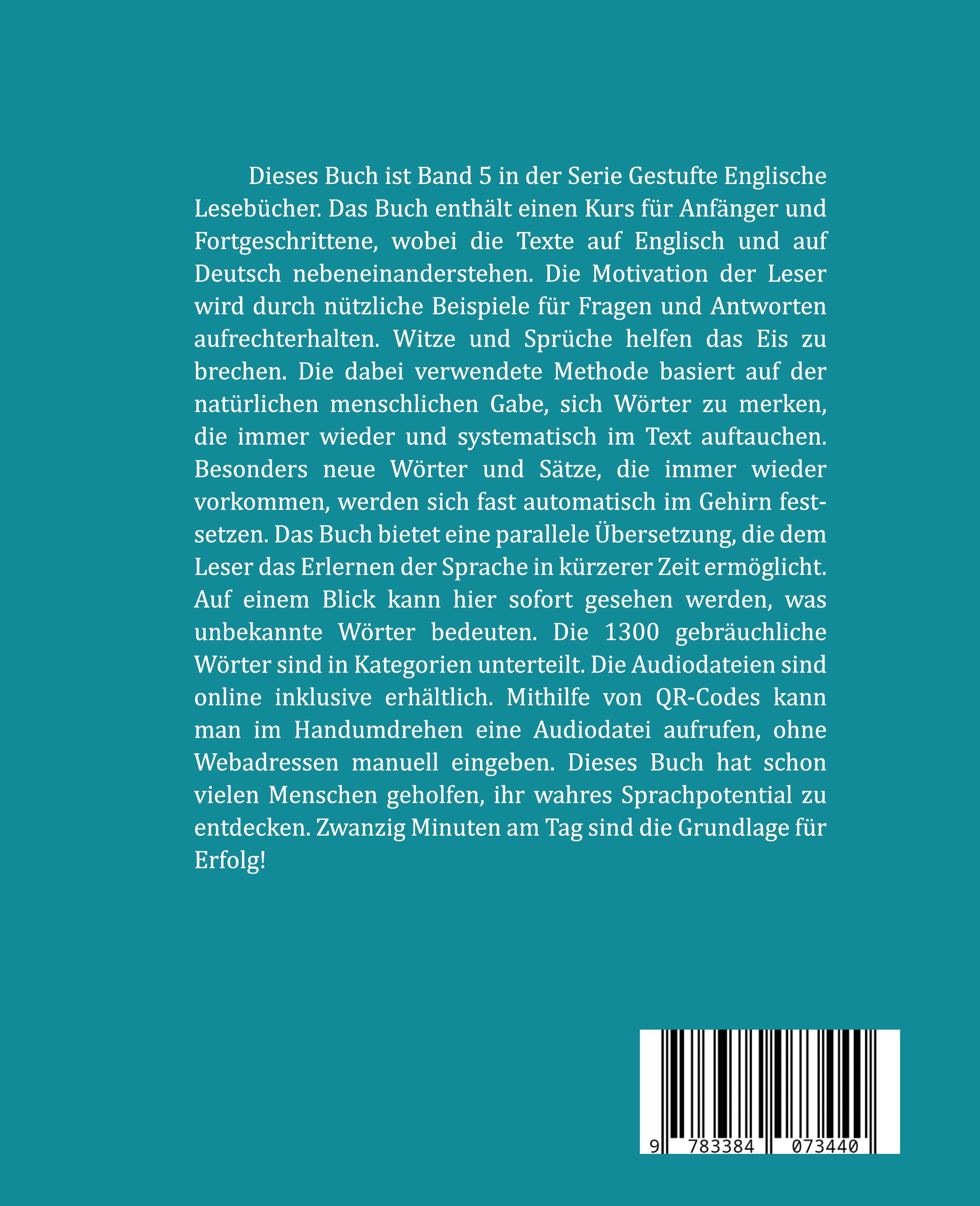 Dieses Buch ist Band 5 in der Serie Gestufte Englische Lesebücher. Das Buch enthält einen Kurs für Anfänger und Fortgeschrittene, wobei die Texte auf Englisch und auf Deutsch nebeneinanderstehen. Die Motivation der Leser wird durch nützliche Beispiele für Fragen und Antworten aufrechterhalten. Witze und Sprüche helfen das Eis zu brechen. Die dabei verwendete Methode basiert auf der natürlichen menschlichen Gabe, sich Wörter zu merken, die immer wieder und systematisch im Text auftauchen. Besonders neue Wörter und Sätze, die immer wieder vorkommen, werden sich fast automatisch im Gehirn festsetzen. Das Buch bietet eine parallele Übersetzung, die dem Leser das Erlernen der Sprache in kürzerer Zeit ermöglicht. Auf einem Blick kann hier sofort gesehen werden, was unbekannte Wörter bedeuten. Die 1300 gebräuchliche Wörter sind in Kategorien unterteilt. Die Audiodateien sind online inklusive erhältlich. Mithilfe von QR-Codes kann man im Handumdrehen eine Audiodatei aufrufen, ohne Webadressen manuell eingeben. Dieses Buch hat schon vielen Menschen geholfen, ihr wahres Sprachpotential zu entdecken. Zwanzig Minuten am Tag sind die Grundlage für Erfolg!