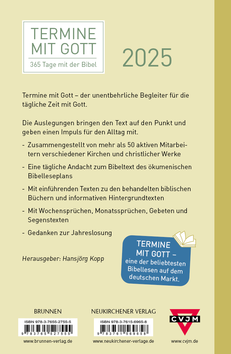 Mehr als 50 aktive Mitarbeiter aus dem CVJM und aus unterschiedlichen Kirchen und christlichen Werken machen die Termine zum unentbehrlichen Begleiter für die tägliche Zeit mit Gott. Die Auslegungen bringen den Text auf den Punkt und geben einen Impuls für den Alltag mit.