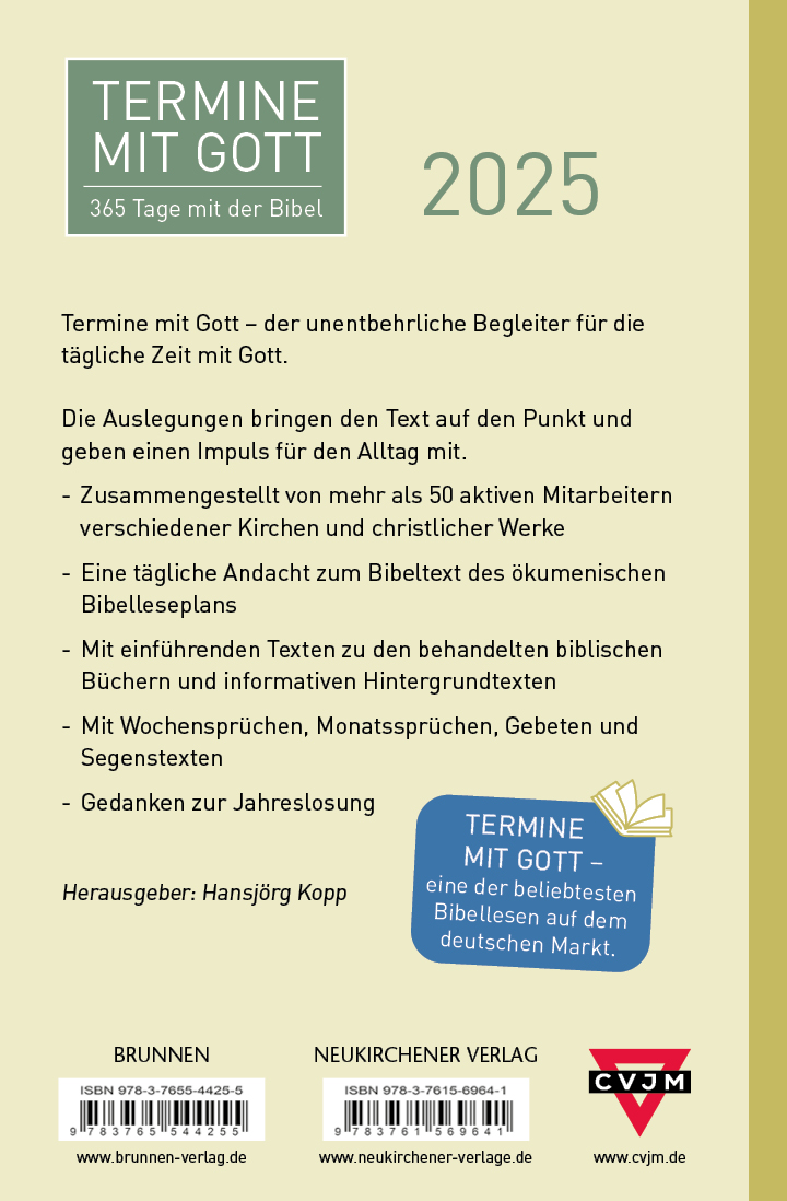 Mehr als 50 aktive Mitarbeiter aus dem CVJM und aus unterschiedlichen Kirchen und christlichen Werken machen die Termine zum unentbehrlichen Begleiter für die tägliche Zeit mit Gott. Die Auslegungen bringen den Text auf den Punkt und geben einen Impuls für den Alltag mit.