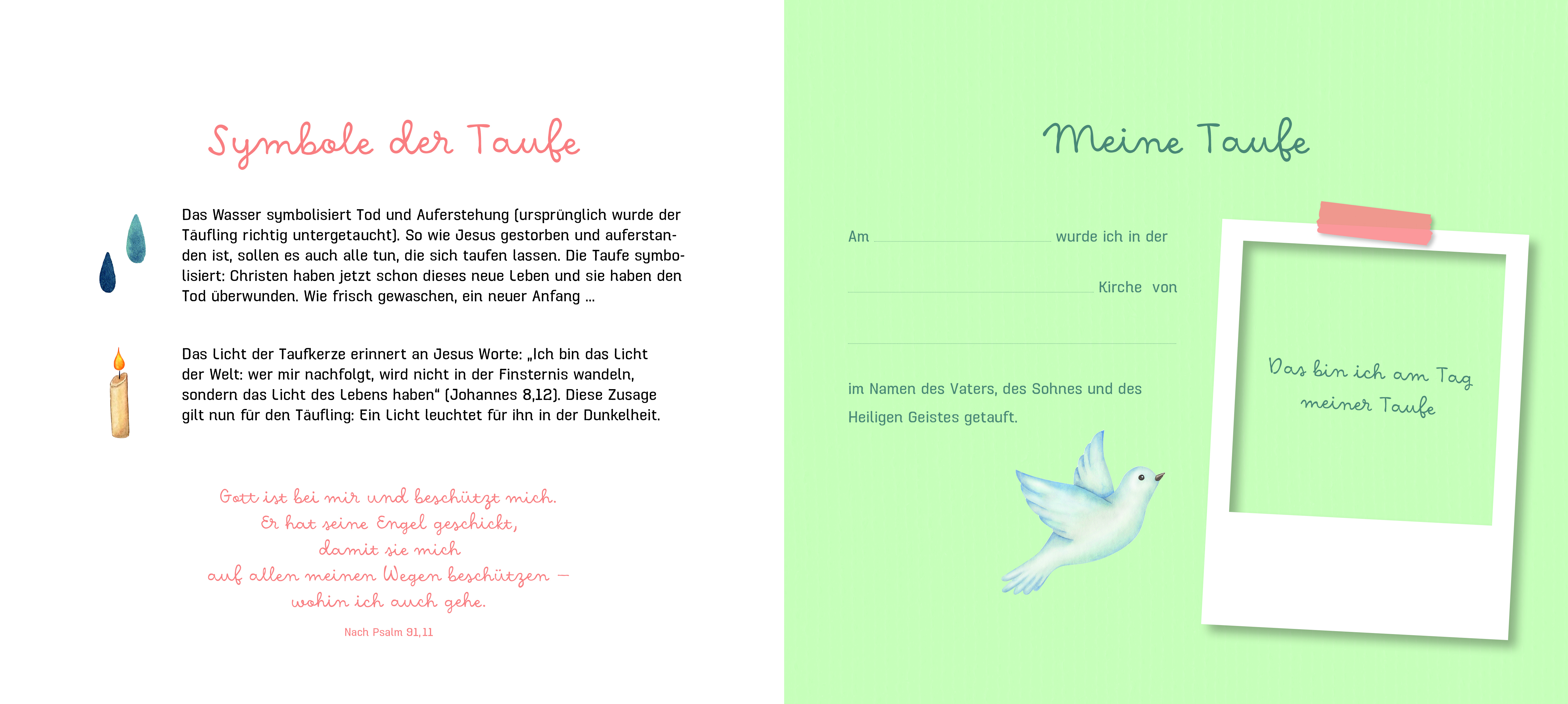 Ergänzend finden sich im Album noch kurze Zitate, Bibelverse, Segensworte und Kindergebete. Am Schluss ist auch noch Raum, um die ersten Fortschritte des Kindes festzuhalten.