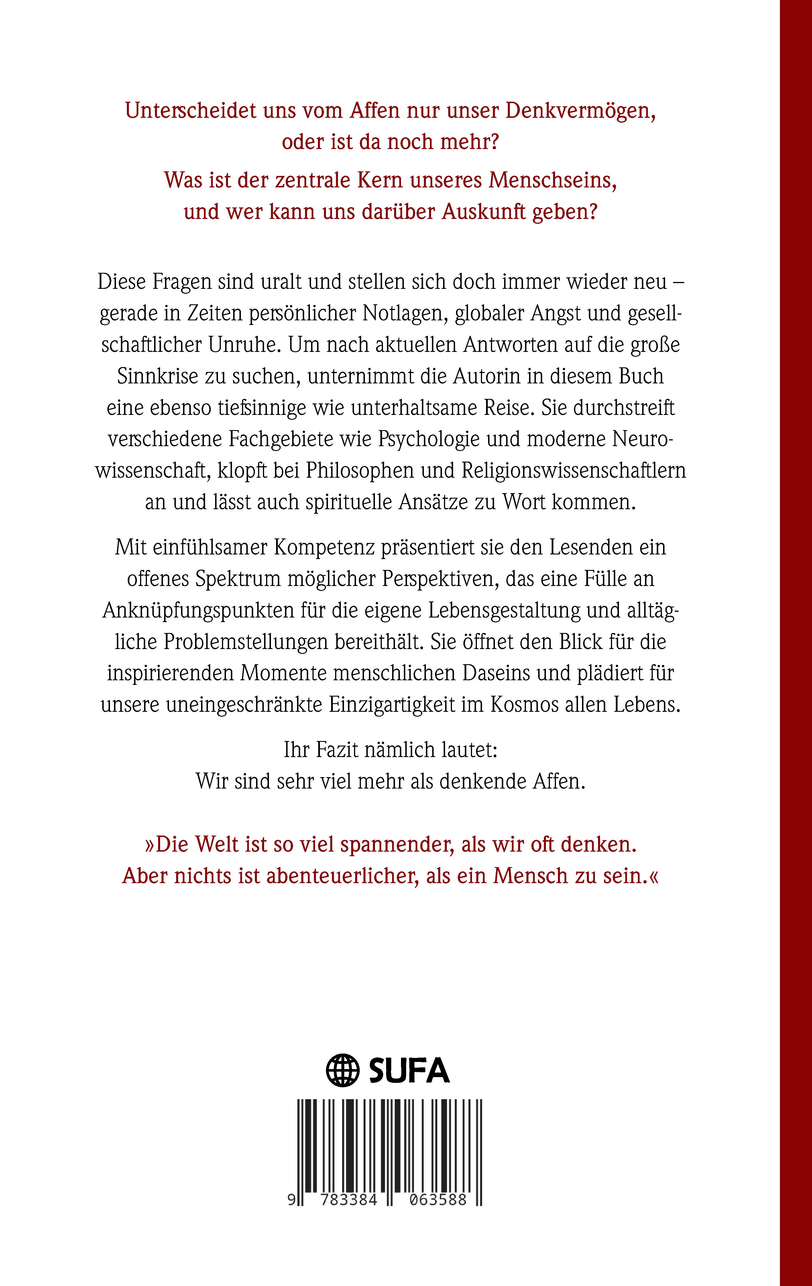 Unterscheidet uns vom Affen nur unser Denkvermögen, oder ist da noch mehr?Was ist der zentrale Kern unseres Menschseins, und wer kann uns darüber Auskunft geben?Diese Fragen sind uralt und stellen sich doch immer wieder neu - gerade in Zeiten persönlicher Notlagen, globaler Angst und gesellschaftlicher Unruhe. Um nach aktuellen Antworten auf die große Sinnkrise zu suchen, unternimmt die Autorin in diesem Buch eine ebenso tiefsinnige wie unterhaltsame Reise. Sie durchstreift verschiedene Fachgebiete wie Psychologie und moderne Neurowissenschaft, klopft bei Philosophen und Religionswissenschaftlern an und lässt auch spirituelle Ansätze zu Wort kommen. Mit einfühlsamer Kompetenz präsentiert sie den Lesenden ein offenes Spektrum möglicher Perspektiven, das eine Fülle an Anknüpfungspunkten für die eigene Lebensgestaltung und alltägliche Problemstellungen bereithält. Sie öffnet den Blick für die inspirierenden Momente menschlichen Daseins und plädiert für unsere uneingeschränkte Einzigartigkeit im Kosmos allen Lebens.Ihr Fazit nämlich lautet: Wir sind sehr viel mehr als denkende Affen.»Die Welt ist so viel spannender, als wir oft denken.Aber nichts ist abenteuerlicher, als ein Mensch zu sein.«