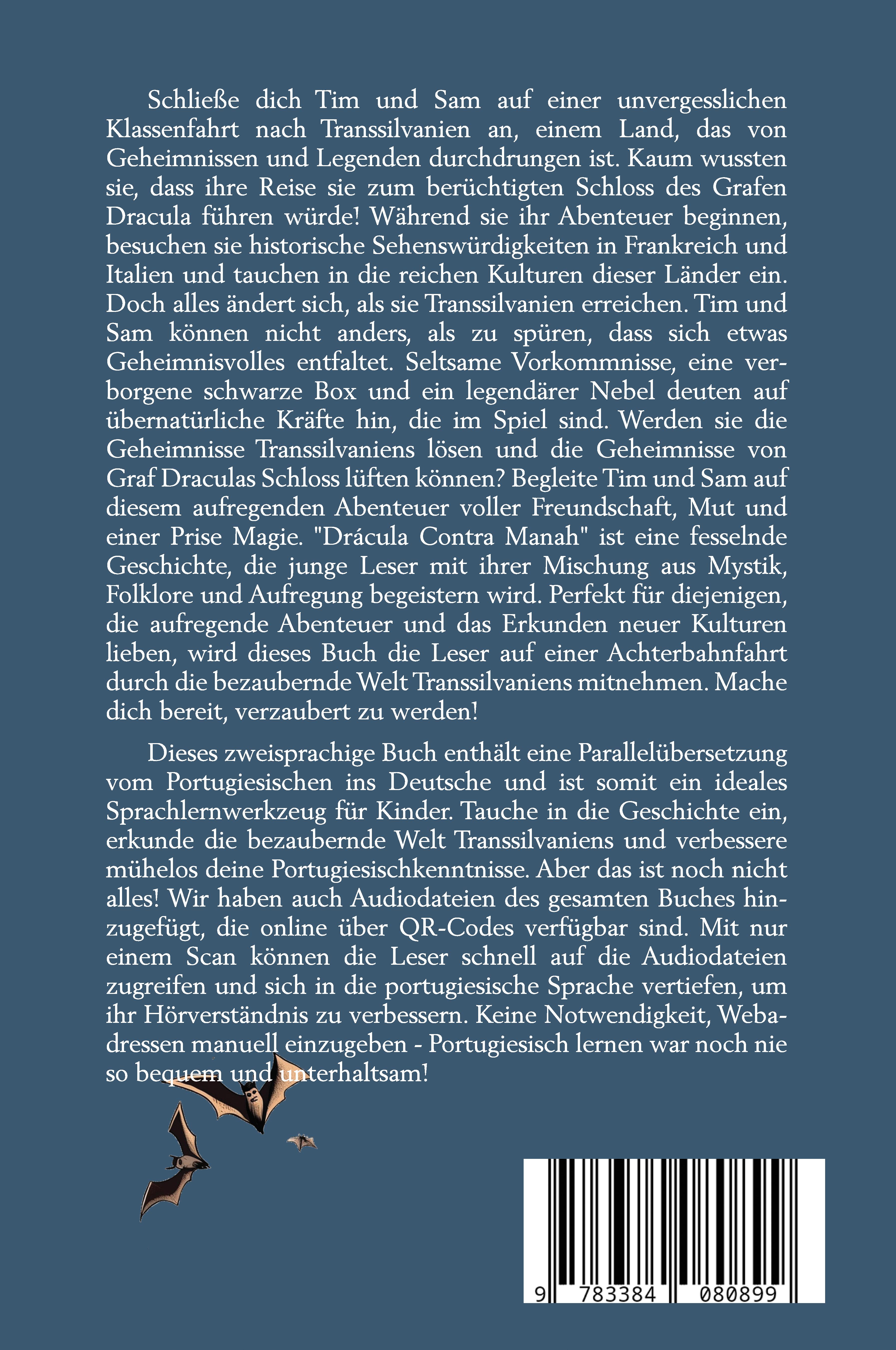 Schließe dich Tim und Sam auf einer unvergesslichen Klassenfahrt nach Transsilvanien an, einem Land, das von Geheimnissen und Legenden durchdrungen ist. Kaum wussten sie, dass ihre Reise sie zum berüchtigten Schloss des Grafen Dracula führen würde! Während sie ihr Abenteuer beginnen, besuchen sie historische Sehenswürdigkeiten in Frankreich und Italien und tauchen in die reichen Kulturen dieser Länder ein. Doch alles ändert sich, als sie Transsilvanien erreichen. Tim und Sam können nicht anders, als zu spüren, dass sich etwas Geheimnisvolles entfaltet. Seltsame Vorkommnisse, eine verborgene schwarze Box und ein legendärer Nebel deuten auf übernatürliche Kräfte hin, die im Spiel sind. Werden sie die Geheimnisse Transsilvaniens lösen und die Geheimnisse von Graf Draculas Schloss lüften können? Begleite Tim und Sam auf diesem aufregenden Abenteuer voller Freundschaft, Mut und einer Prise Magie. "Drácula Contra Manah" ist eine fesselnde Geschichte, die junge Leser mit ihrer Mischung aus Mystik, Folklore und Aufregung begeistern wird. Perfekt für diejenigen, die aufregende Abenteuer und das Erkunden neuer Kulturen lieben, wird dieses Buch die Leser auf einer Achterbahnfahrt durch die bezaubernde Welt Transsilvaniens mitnehmen. Mache dich bereit, verzaubert zu werden!Dieses zweisprachige Buch enthält eine Parallelübersetzung vom Portugiesischen ins Deutsche und ist somit ein ideales Sprachlernwerkzeug für Kinder. Tauche in die Geschichte ein, erkunde die bezaubernde Welt Transsilvaniens und verbessere mühelos deine Portugiesischkenntnisse. Aber das ist noch nicht alles! Wir haben auch Audiodateien des gesamten Buches hinzugefügt, die online über QR-Codes verfügbar sind. Mit nur einem Scan können die Leser schnell auf die Audiodateien zugreifen und sich in die portugiesische Sprache vertiefen, um ihr Hörverständnis zu verbessern. Keine Notwendigkeit, Webadressen manuell einzugeben - Portugiesisch lernen war noch nie so bequem und unterhaltsam!