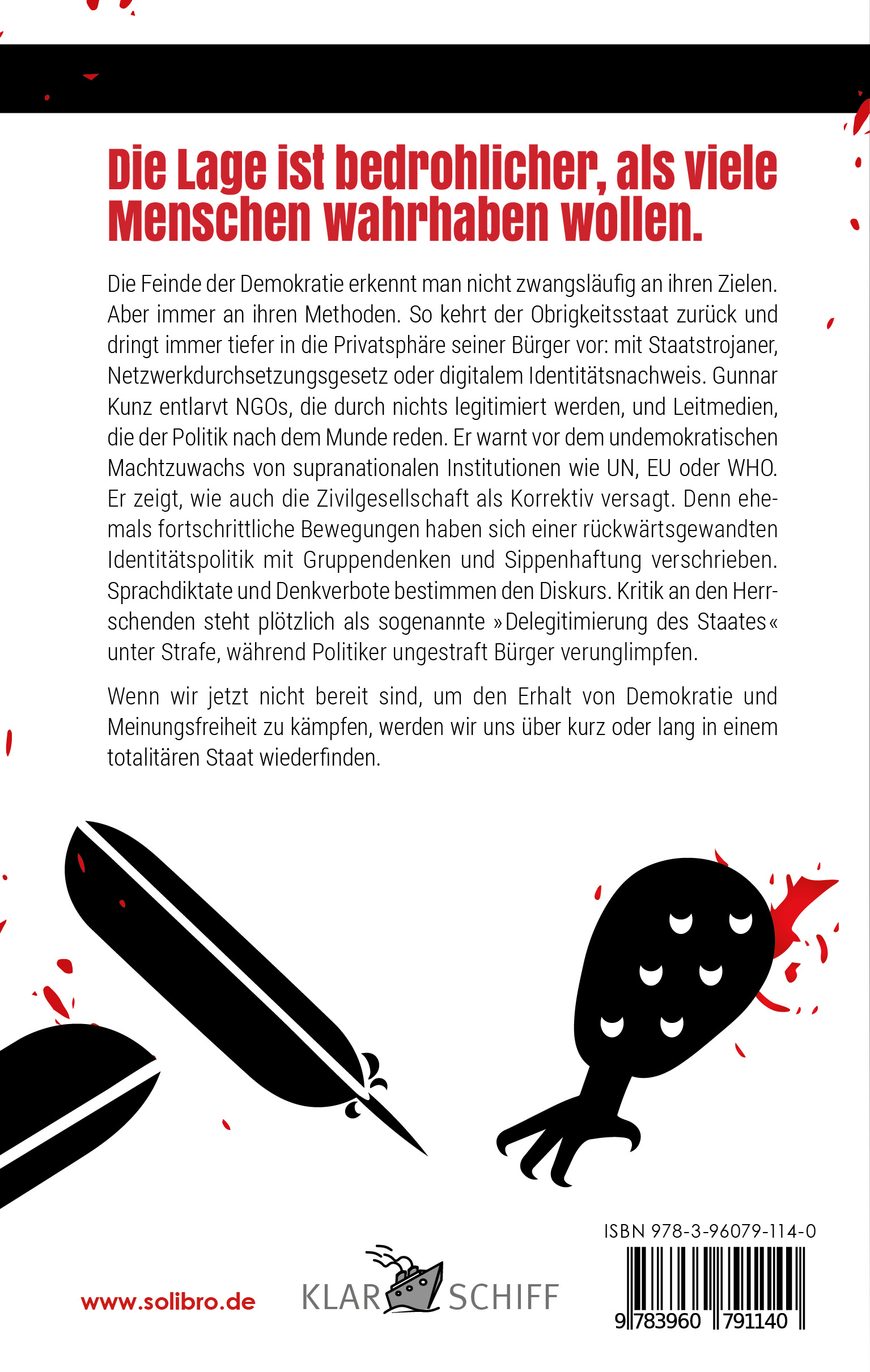 Die Lage ist bedrohlicher, als viele Menschen wahrhaben wollen. Der Obrigkeitsstaat kehrt zurück und dringt immer tiefer in die Privatsphäre seiner Bürger vor: mit Staatstrojaner, Netzwerkdurchsetzungsgesetz oder digitalem Identitätsnachweis. Gunnar Kunz entlarvt NGOs, die durch nichts legitimiert werden, und Leitmedien, die der Politik nach dem Munde reden. Er warnt vor dem undemokratischen Machtzuwachs von supranationalen Institutionen wie UN, EU oder WHO. Er zeigt, wie auch die Zivilgesellschaft als Korrektiv versagt. Denn ehemals fortschrittliche Bewegungen haben sich einer rückwärtsgewandten Identitätspolitik mit Gruppendenken und Sippenhaftung verschrieben. Sprachdiktate und Denkverbote bestimmen den Diskurs. Kritik an den Herrschenden steht plötzlich als sogenannte »Delegitimierung des Staates« unter Strafe, während Politiker ungestraft Bürger verunglimpfen. Wenn wir jetzt nicht bereit sind, um den Erhalt von Demokratie und Meinungsfreiheit zu kämpfen, werden wir uns über kurz oder lang in einem totalitären Staat wiederfinden. Dieses Buch geht mit einer Fülle von Belegen und nachprüfbaren Quellenangaben den antidemokratischen Tendenzen auf den Grund und hält ein leidenschaftliches Plädoyer für eine Rückkehr zu Meinungsvielfalt, sachlichen Debatten und Respekt vor "Andersdenkenden".