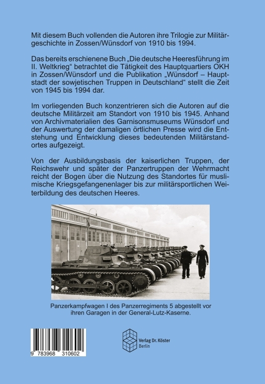 Mit diesem Buch vollenden die Autoren ihre Trilogie zur Militärgeschichte in Zossen/Wünsdorf von 1910 bis 1994.Im vorliegenden Buch wird die deutsche Militärzeit am Standort von 1910 bis 1945 detailliert dargestellt, wobei die Zeit des II. Weltkrieges Inhalt des bereits erschienenen Buches "Die deutsche Heeresführung im II. Weltkrieg" ist.Anhand der umfangreichen Archivmaterialien des Garnisonsmuseums Wünsdorf und der persönlichen Auswertung der damaligen örtlichen Presse wird die Entstehung und Entwicklung dieses bedeutenden Ortes der deutschen Militärgeschichte aufgezeigt.Von der Ausbildungsbasis der kaiserlichen Truppen, der Reichswehr und später der Panzertruppen der Wehrmacht reicht der Bogen über die Nutzung des Standortes für muslimische Kriegsgefangenenlager bis zur militärsportlichen Weiterbildung des deutschen Heeres.