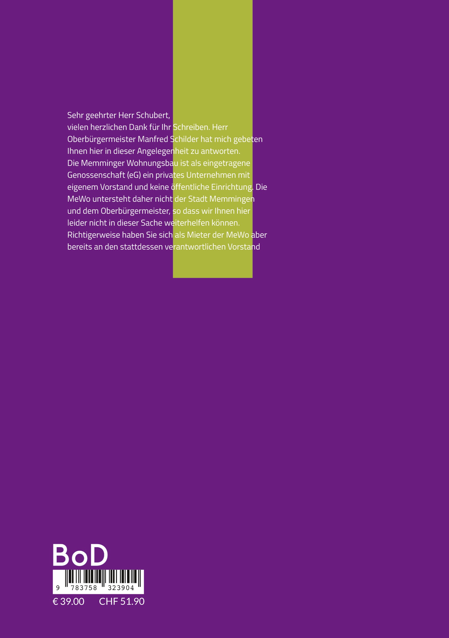 Sehr geehrter Herr Schubert,vielen herzlichen Dank für Ihr Schreiben. Herr Oberbürgermeister Manfred Schilder hat mich gebeten Ihnen hier in dieser Angelegenheit zu antworten.Die Memminger Wohnungsbau ist als eingetragene Genossenschaft (eG) ein privates Unternehmen mit eigenem Vorstand und keine öffentliche Einrichtung. Die MeWo untersteht daher nicht der Stadt Memmingen und dem Oberbürgermeister, so dass wir Ihnen hier leider nicht in dieser Sache weiterhelfen können.Richtigerweise haben Sie sich als Mieter der MeWo aber bereits an den stattdessen verantwortlichen Vorstand der MEWO mit Ihrem Anliegen gewandt. Wir hoffen, dass dieser Ihnen bei Ihrem Anliegen weiterhelfen kann und verbleibenmit freundlichen GrüßenMatthias FähndrichDipl.-Verwaltungswirt (FH)Stv. LeiterBüro des Oberbürgermeisters