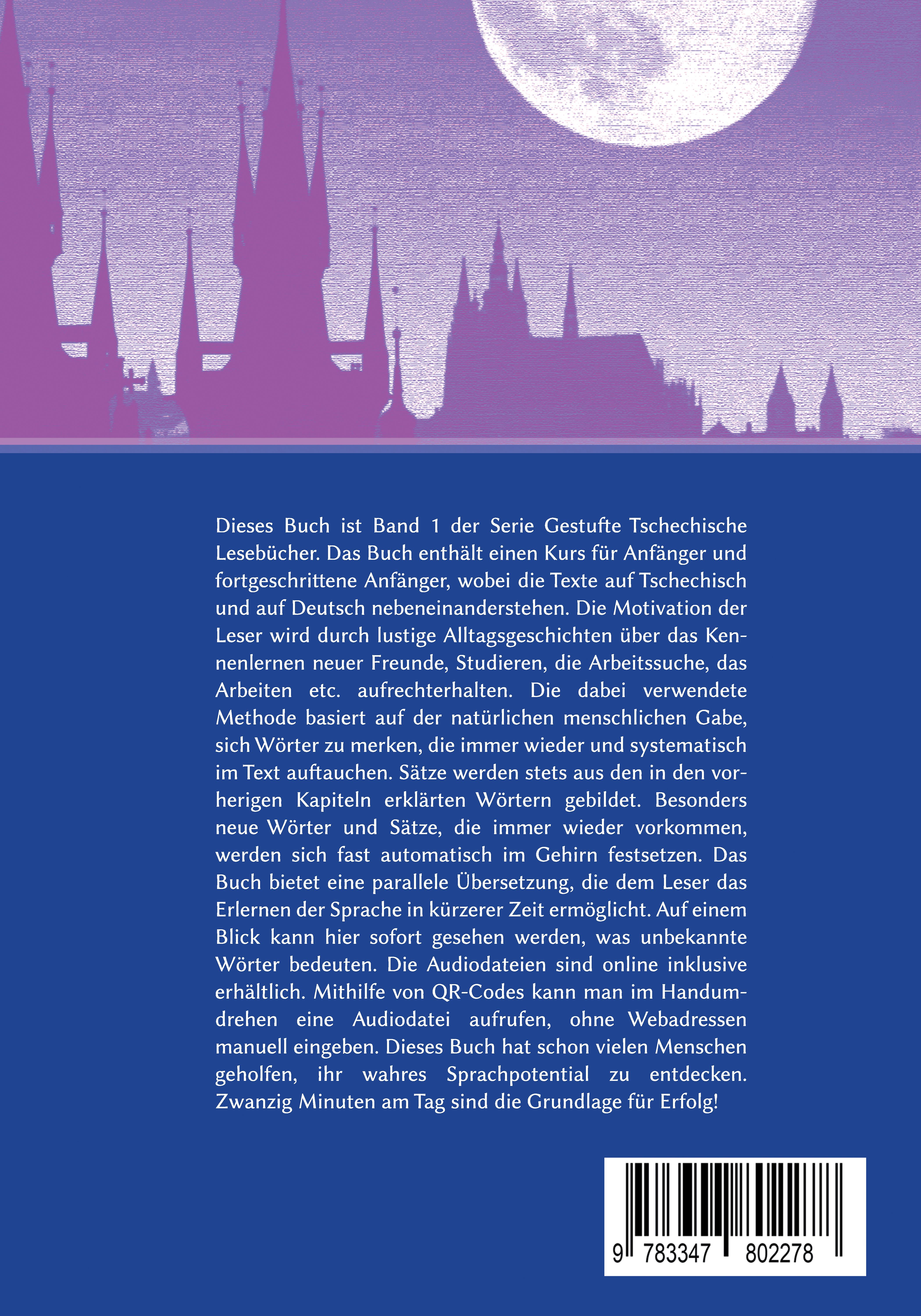 Dieses Buch ist Band 1 der Serie Gestufte Tschechische Lesebücher. Das Buch enthält einen Kurs für Anfänger und fortgeschrittene Anfänger, wobei die Texte auf Tschechisch und auf Deutsch nebeneinanderstehen. Die Motivation der Leser wird durch lustige Alltagsgeschichten über das Kennenlernen neuer Freunde, Studieren, die Arbeitssuche, das Arbeiten etc. aufrechterhalten. Die dabei verwendete Methode basiert auf der natürlichen menschlichen Gabe, sich Wörter zu merken, die immer wieder und systematisch im Text auftauchen. Sätze werden stets aus den in den vorherigen Kapiteln erklärten Wörtern gebildet. Besonders neue Wörter und Sätze, die immer wieder vorkommen, werden sich fast automatisch im Gehirn festsetzen. Das Buch bietet eine parallele Übersetzung, die dem Leser das Erlernen der Sprache in kürzerer Zeit ermöglicht. Auf einem Blick kann hier sofort gesehen werden, was unbekannte Wörter bedeuten. Die Audiodateien sind online inklusive erhältlich. Mithilfe von QR-Codes kann man im Handumdrehen eine Audiodatei aufrufen, ohne Webadressen manuell eingeben. Dieses Buch hat schon vielen Menschen geholfen, ihr wahres Sprachpotential zu entdecken. Zwanzig Minuten am Tag sind die Grundlage für Erfolg!