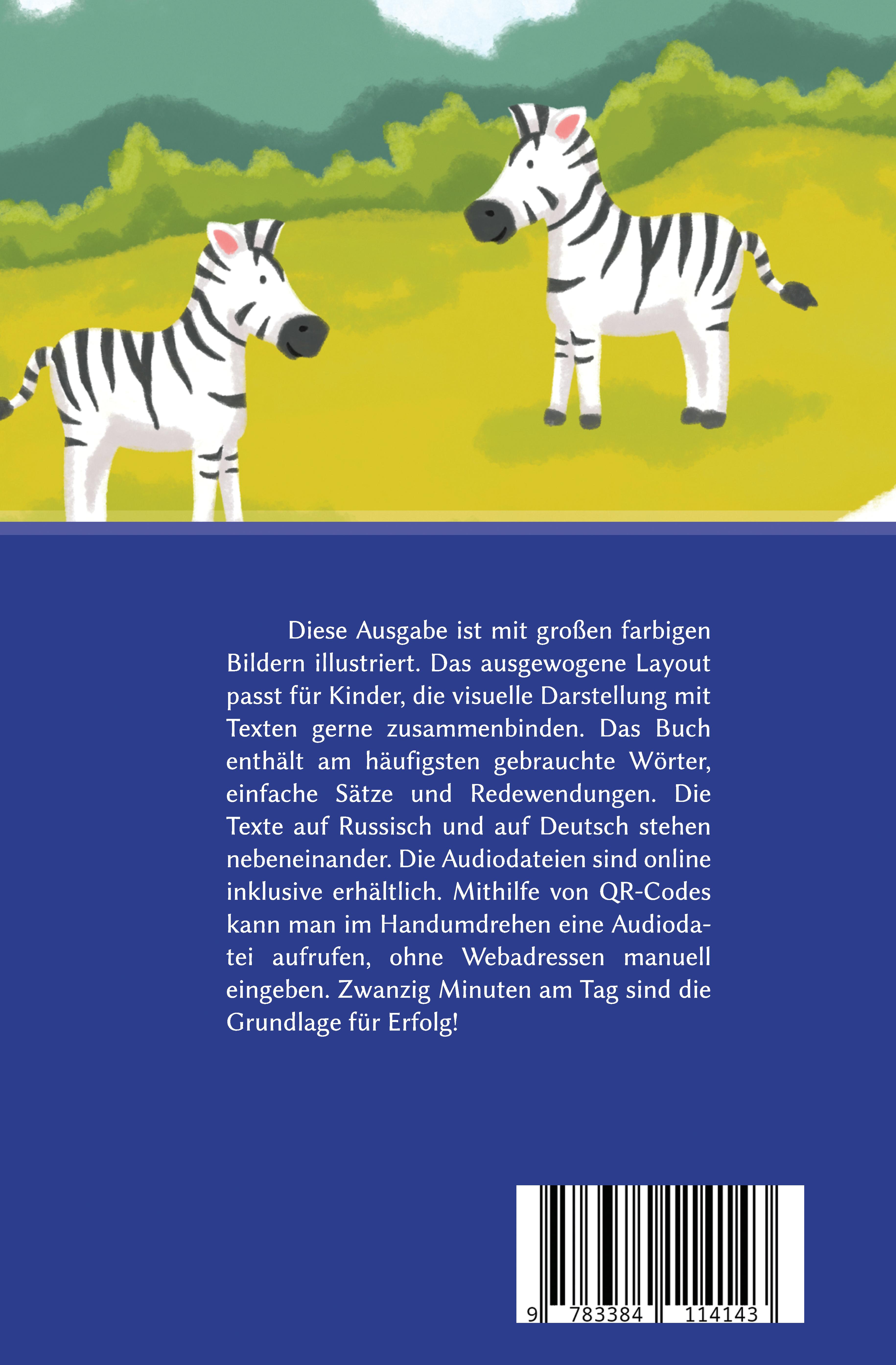 Diese Ausgabe ist mit großen farbigen Bildern illustriert. Das ausgewogene Layout passt für Kinder, die visuelle Darstellung mit Texten gerne zusammenbinden. Das Buch enthält am häufigsten gebrauchte Wörter, einfache Sätze und Redewendungen. Die Texte auf Russisch und auf Deutsch stehen nebeneinander. Die Audiodateien sind online inklusive erhältlich. Mithilfe von QR-Codes kann man im Handumdrehen eine Audiodatei aufrufen, ohne Webadressen manuell eingeben. Zwanzig Minuten am Tag sind die Grundlage für Erfolg!